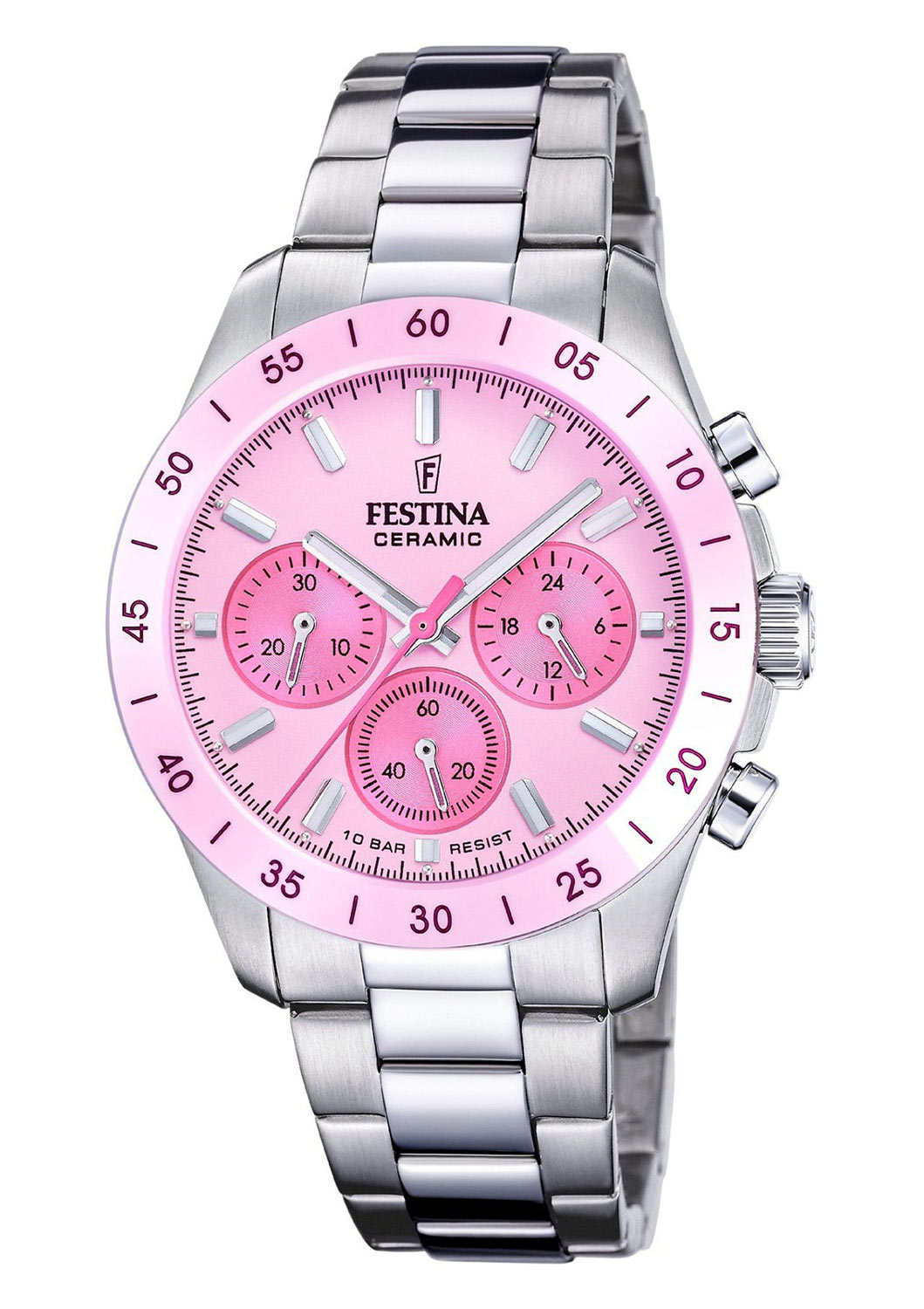 Pod mineralnym szkłem umiejscowiona została czytelna tarcza z dużymi wskazówkami oraz indeksami. Wypełnione są masą luminescencyjną, która ułatwi odczytanie godziny w gorszym oświetleniu. Tarcza wyróżnia się nie tylko kolorystyką — na godzinie 6 i 9 starannie ułożone zostały różowe liczniki chronografu. Chronograf inaczej nazwany stoperem pomoże dokładnie zmierzyć czas. Licznikom towarzyszy dodatkowa subtarcza odpowiedzialna za wskazywanie czasu dobowego 12/24h. Na godzinie szóstej podana jest informacja o klasie szczelności tego modelu. Zegarek Festina na bransolecie posiada wodoszczelność do 100 metrów — pozwala to na swobodne pływanie z czasomierzem na nadgarstku.