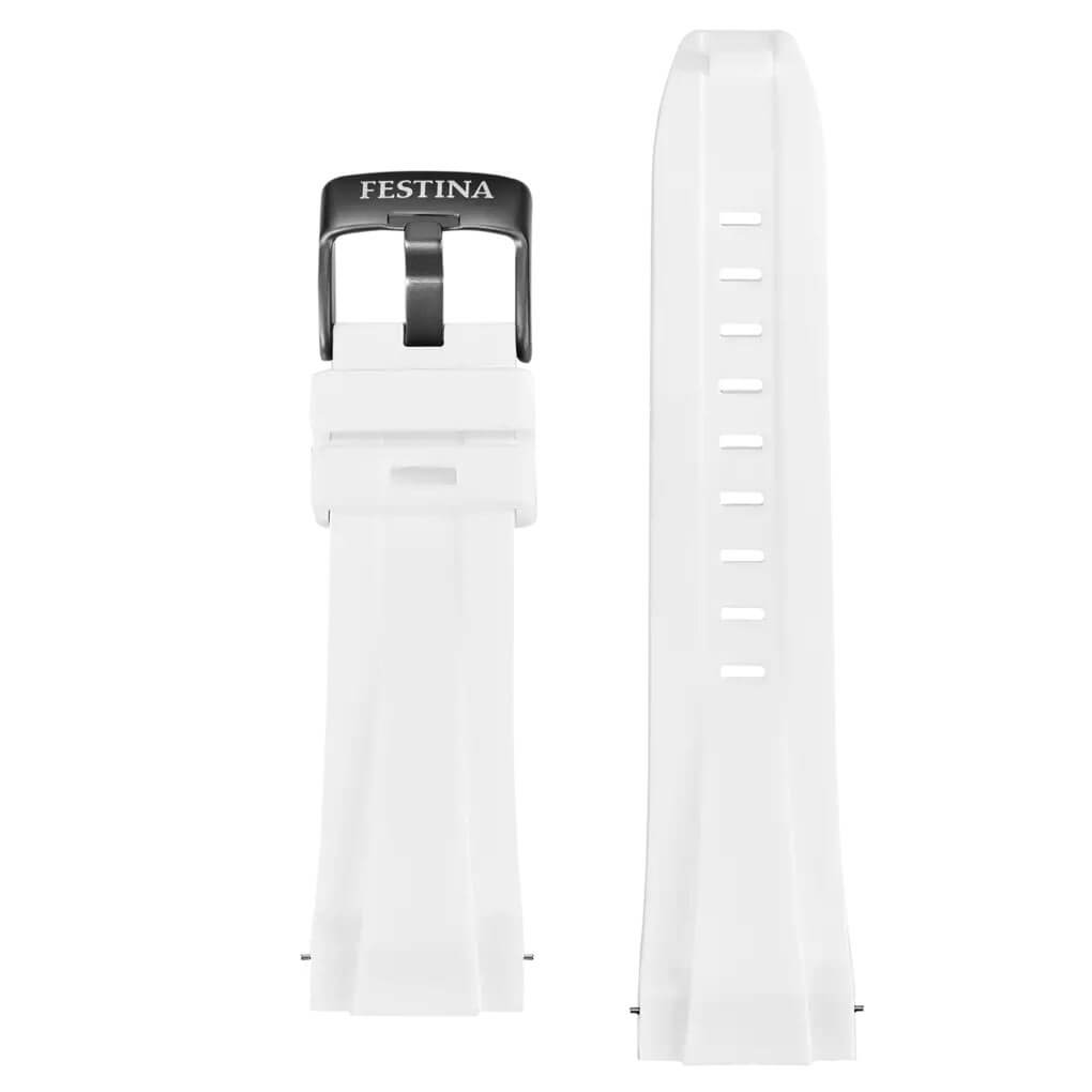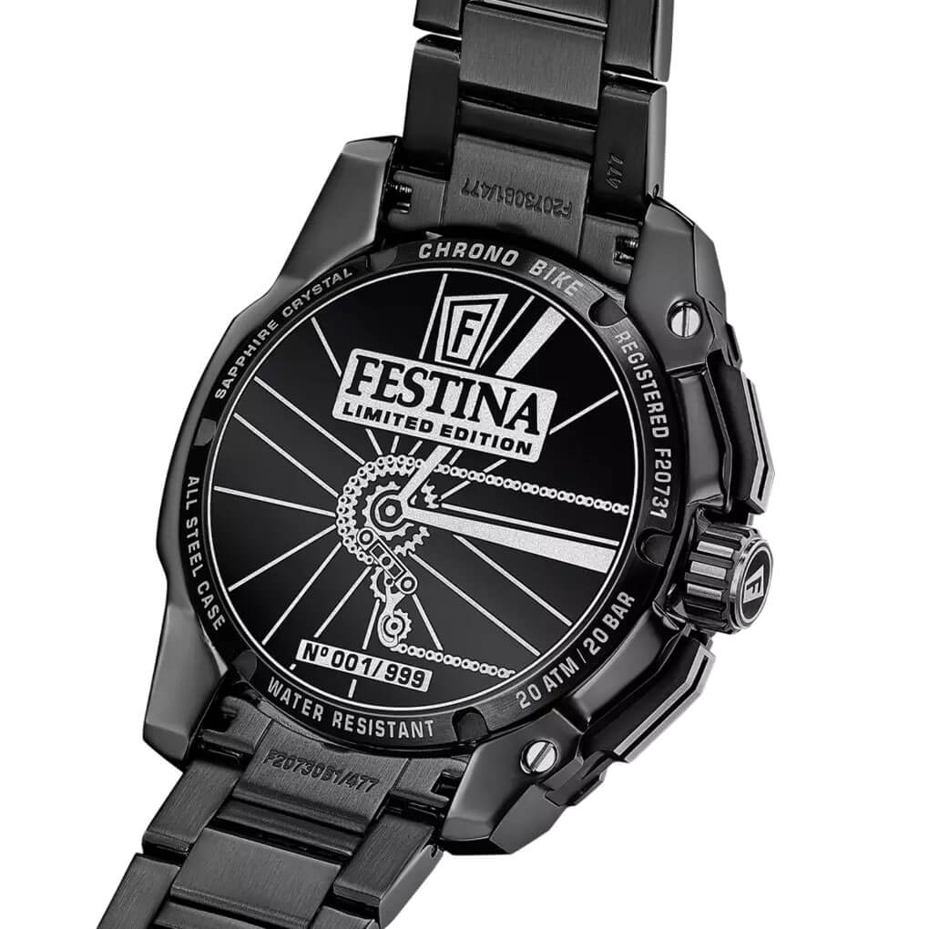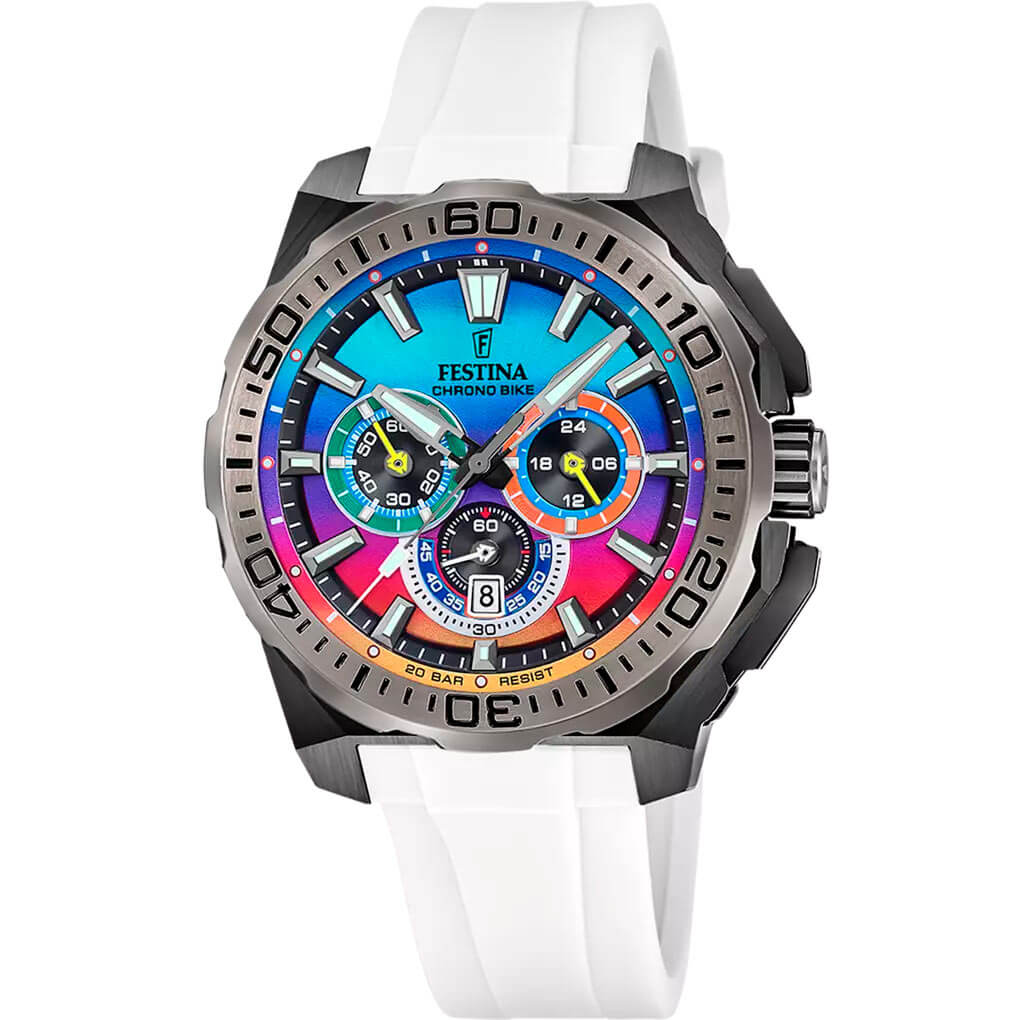 Trójdzielna, wielokolorowa tarcza z chronografem, datownikiem i skalą tachymetru została rozplanowana w sposób maksymalnie czytelny – bo tu każdy detal ma zadanie, nie tylko funkcję estetyczną. Luminescencja pomoże w odczytaniu danych z tarczy w gorszym oświetleniu. Model ten to niezwykłe możliwości dokładnego śledzenia upływającego czasu. Chronograf zmierzy precyzyjnie czas okrążenia, a tachymetr prędkość w odległości do 1 km. Precyzja to kluczowa zaleta czasomierza Festina Chrono Bike 2025.