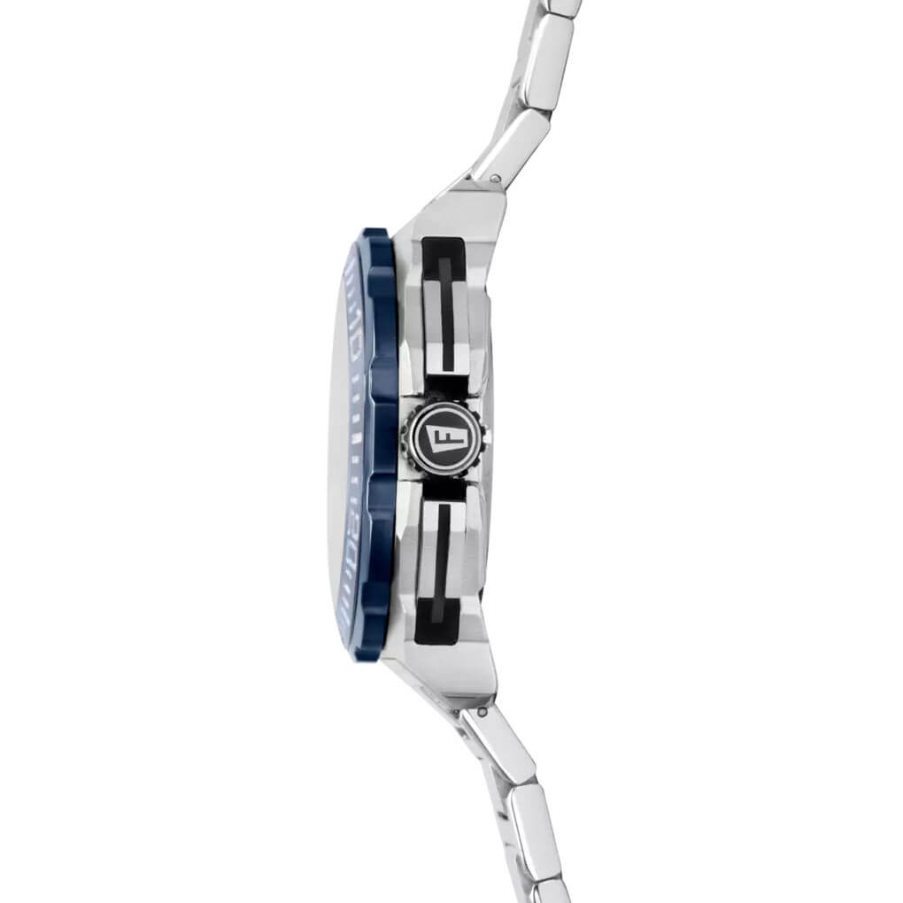 Wyrazista, srebrna kolorystyka z wyrazistym odcieniem chłodnego błękitu nadaje modelowi lekko futurystyczny, a jednocześnie przejrzysty wygląd. Obrotowy bezel z precyzyjną skalą, szczotkowana, 45.50-milimetrowa koperta i stalowa bransoleta układają się w zwartą, spójną całość, której forma podąża za funkcją. Z zegarkiem Festina można pływać i nurkować dzięki zakręcanej koronce i klasie szczelności do 200 metrów. Na tarczy znalazły się subtarcze chronografu oraz okno datownika na godzinie szóstej – rozplanowane z myślą o maksymalnej czytelności. Indeksy i wskazówki z warstwą luminescencyjną zapewniają widoczność nawet po zmroku. To projekt przemyślany pod kątem ergonomii – zegarek dobrze leży na nadgarstku, nie dominuje, ale zdecydowanie się wyróżnia.