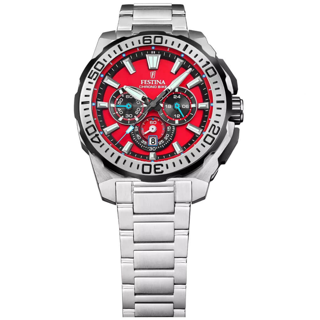Wyrazista, srebrna kolorystyka nadaje modelowi klasyczny wygląd. Obrotowy bezel z precyzyjną skalą, szczotkowana, 45.50-milimetrowa koperta i stalowa bransoleta układają się w zwartą, spójną całość, której forma podąża za funkcją. Z zegarkiem Festina można pływać i nurkować dzięki zakręcanej koronce i klasie szczelności do 200 metrów. Na czerwonej tarczy znalazły się subtarcze chronografu oraz okno datownika na godzinie szóstej – rozplanowane z myślą o maksymalnej czytelności. Indeksy i wskazówki z warstwą luminescencyjną zapewniają widoczność nawet po zmroku. To projekt przemyślany pod kątem ergonomii – zegarek dobrze leży na nadgarstku, nie dominuje, ale zdecydowanie się wyróżnia.