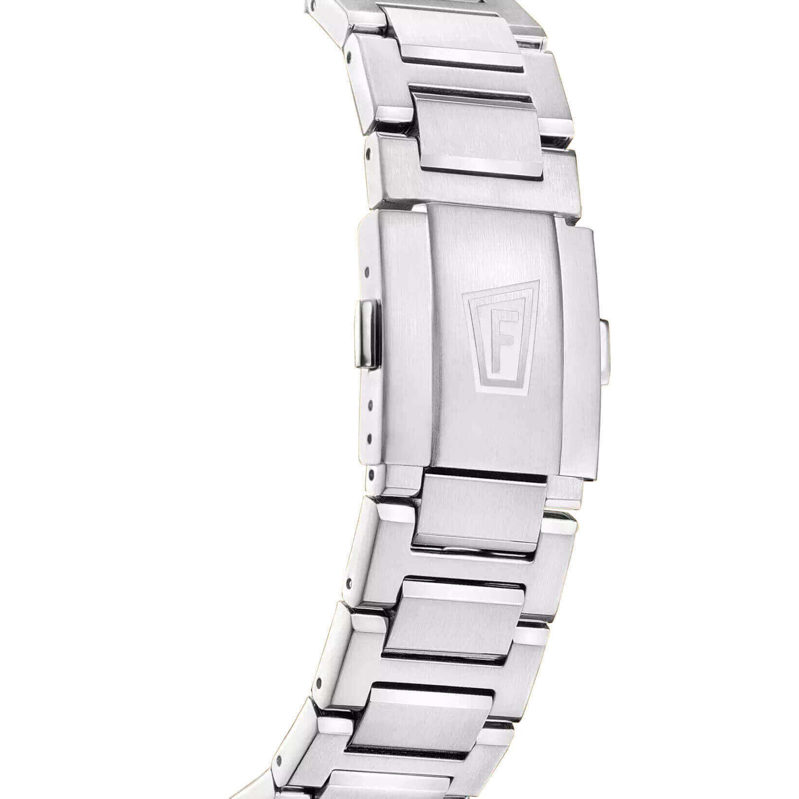 Wyrazista, srebrna kolorystyka nadaje modelowi klasyczny wygląd. Obrotowy bezel z precyzyjną skalą, szczotkowana, 45.50-milimetrowa koperta i stalowa bransoleta układają się w zwartą, spójną całość, której forma podąża za funkcją. Z zegarkiem Festina można pływać i nurkować dzięki zakręcanej koronce i klasie szczelności do 200 metrów. Na czarnej tarczy znalazły się subtarcze chronografu oraz okno datownika na godzinie szóstej – rozplanowane z myślą o maksymalnej czytelności. Indeksy i wskazówki z warstwą luminescencyjną zapewniają widoczność nawet po zmroku. To projekt przemyślany pod kątem ergonomii – zegarek dobrze leży na nadgarstku, nie dominuje, ale zdecydowanie się wyróżnia.
