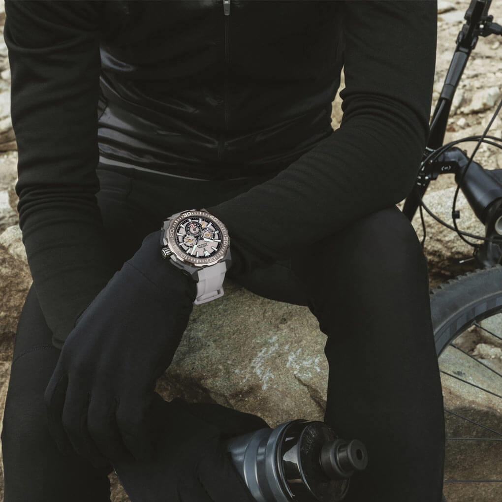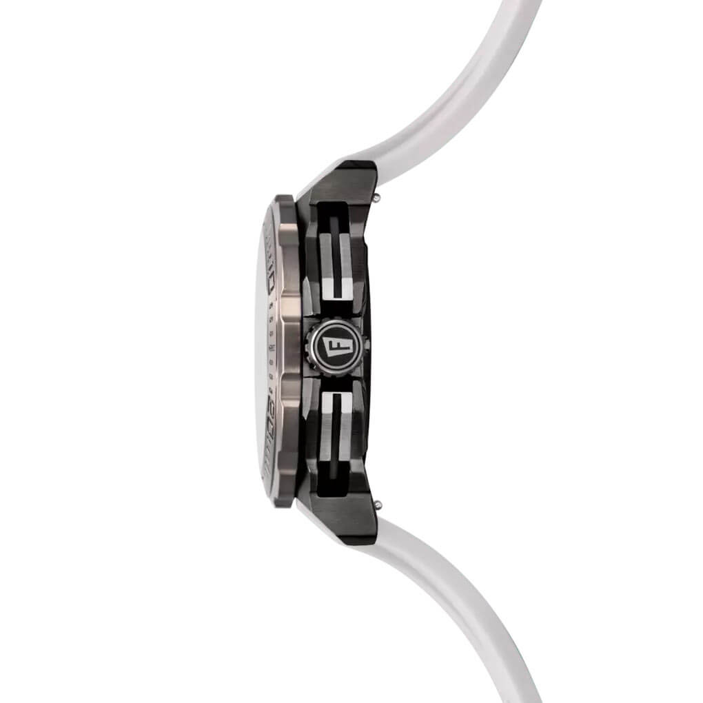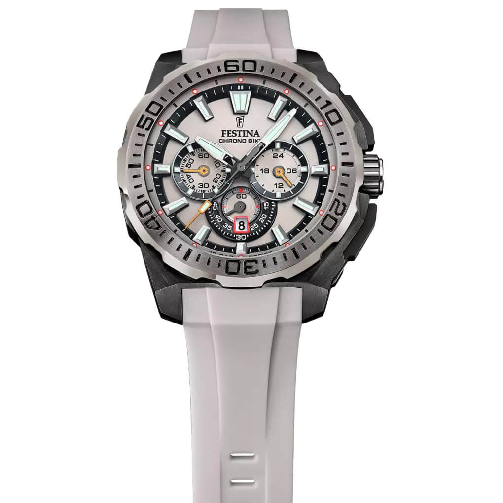 Wyrazista kolorystyka nadaje modelowi klasyczny wygląd. Obrotowy bezel z precyzyjną skalą, szczotkowana, 45.50-milimetrowa koperta z czarną powłoką PVD i gumowy pasek układają się w zwartą, spójną całość, której forma podąża za funkcją. Z zegarkiem Festina można pływać i nurkować dzięki zakręcanej koronce i klasie szczelności do 200 metrów. Na szarej tarczy znalazły się subtarcze chronografu oraz okno datownika na godzinie szóstej – rozplanowane z myślą o maksymalnej czytelności. Indeksy i wskazówki z warstwą luminescencyjną zapewniają widoczność nawet po zmroku. To projekt przemyślany pod kątem ergonomii – zegarek dobrze leży na nadgarstku, nie dominuje, ale zdecydowanie się wyróżnia.
