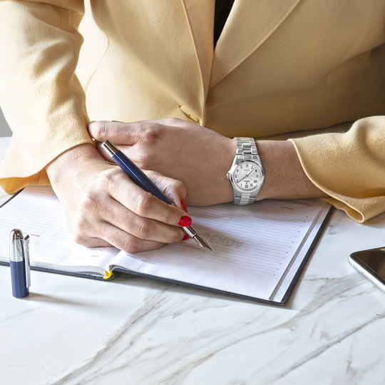 Kolejny wyróżniający element stanowi obudowa. Zarówno koperta o rozmiarze 31 mm, jak i trzyrzędowa bransoleta z zapięciem na dwa przyciski, zostały wykonane z hipoalergicznej stali nierdzewnej 316L. Zastosowanie dwóch rodzajów wykończeń silnie oddziałuje na rzecz elegancji tego modelu i dodaje mu ekstrawagancji. Stonowany odcień stali pasuje do każdej kreacji oraz okoliczności, a do tego jest praktyczny i nieskazitelny.