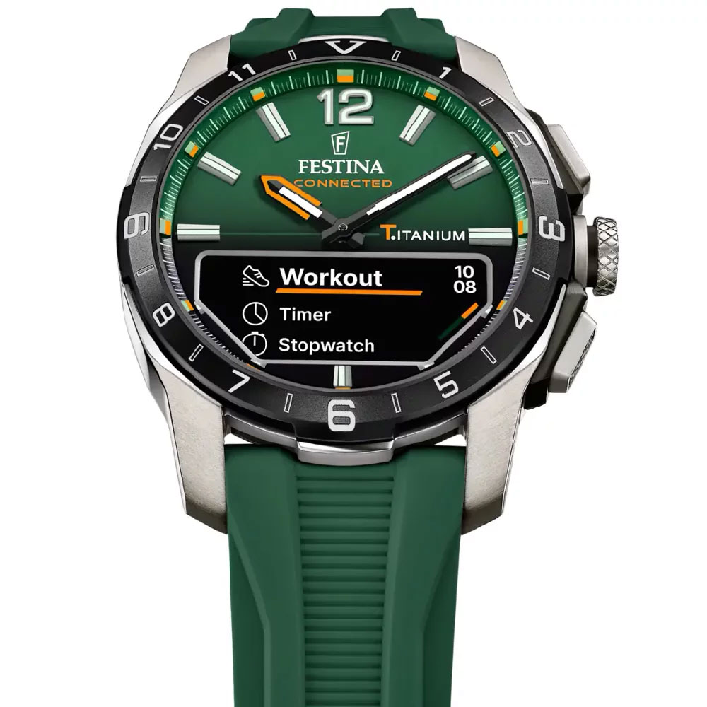 Festina Connected D F23000-2 to zegarek z kopertą w rozmiarze 45 mm. Hiszpańska marka wybrała wyjątkowy materiał do stworzenia tego modelu. Obudowa wykonana jest z lekkiego tytanu, który zwiększa komfort w czasie użytkowania. Po prawej stronie koperty umieszczone zostały przyciski funkcyjne, a na rewersie dekiel ze specjalnymi czujnikami do mierzenia tętna. Model ten zawieszony został na pasku gumowym w kolorze zielonym. Elastyczny i wodoodporny pasek zagwarantuje wygodę w czasie noszenia, jak i łatwe utrzymanie go w czystości.