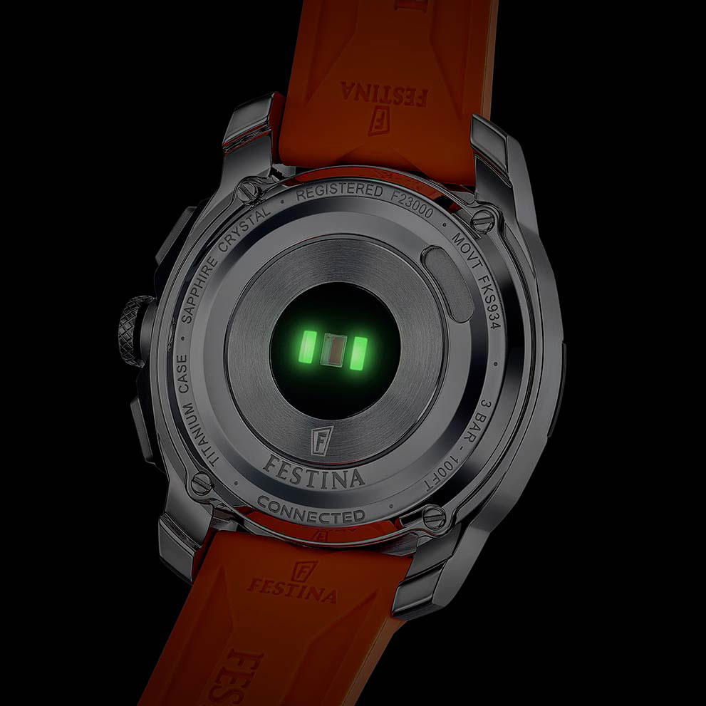Festina Connected D F23000-7 to zegarek z kopertą w rozmiarze 45 mm. Hiszpańska marka wybrała wyjątkowy materiał do stworzenia tego modelu. Obudowa wykonana jest z lekkiego tytanu, który zwiększa komfort w czasie użytkowania. Po prawej stronie koperty umieszczone zostały przyciski funkcyjne, a na rewersie dekiel ze specjalnymi czujnikami do mierzenia tętna. Model ten zawieszony został na pasku gumowym w kolorze pomarańczowym. Elastyczny i wodoodporny pasek zagwarantuje wygodę w czasie noszenia, jak i łatwe utrzymanie go w czystości.