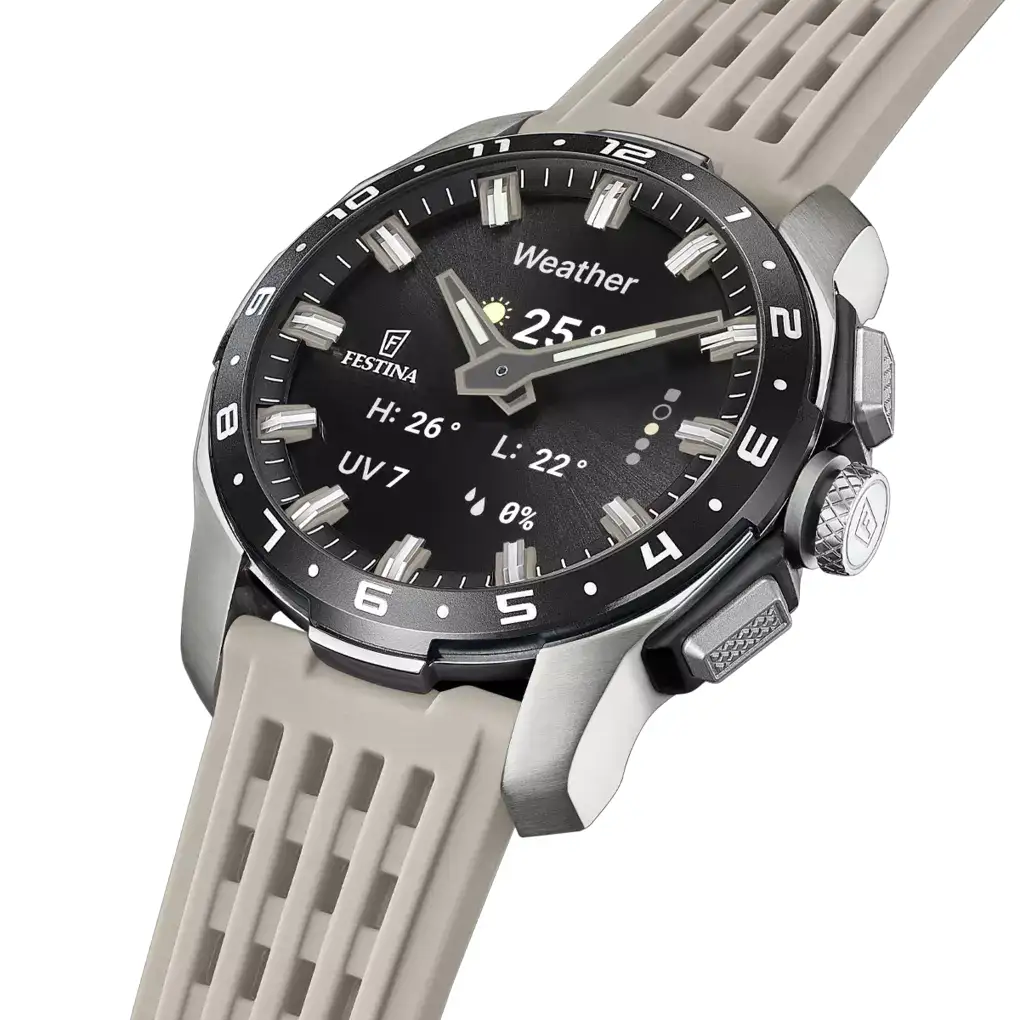 Festina Connected Full D F23305/7 to trwały instrument dla mężczyzn, którzy cenią konkretne rozwiązania i nowoczesne materiały. Połączenie tytanu, szafiru i beżowego kauczuku tworzy unikalny styl, który pasuje zarówno do sportowej odzieży, jak i codziennego ubioru casual. To funkcjonalny i wytrzymały zegarek, który dzięki wodoszczelności 5 ATM oraz przejrzystemu interfejsowi cyfrowo-analogowemu sprosta wymaganiom najbardziej aktywnych użytkowników.