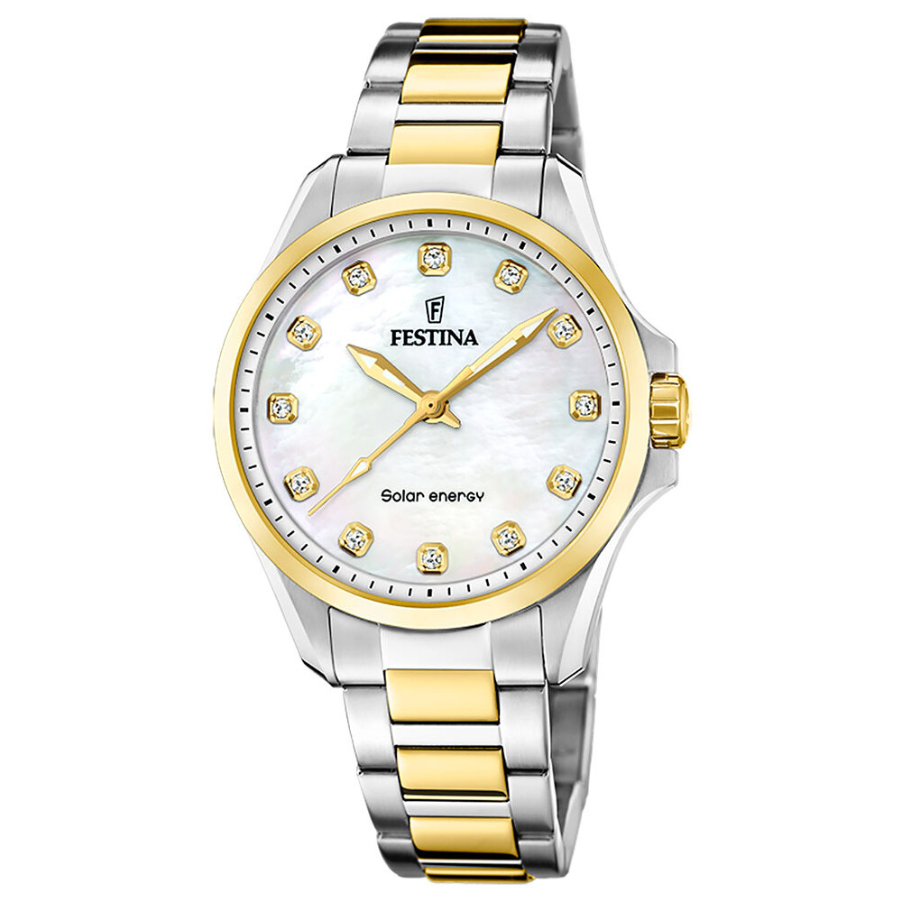 Solarny zegarek damski bicolor Festina Petite. Elegancka tarcza z masy perłowej wysadzana kryształkami. Kształtne, pozłacane wskazówki wypełnione materiałem luminescencyjnym. Japoński mechanizm kwarcowy z modułem solarnym. Koperta i bransoleta ze stali nierdzewnej 316L o dwóch rodzajach wykończeń — złotym polerowanym PVD oraz szczotkowanym.