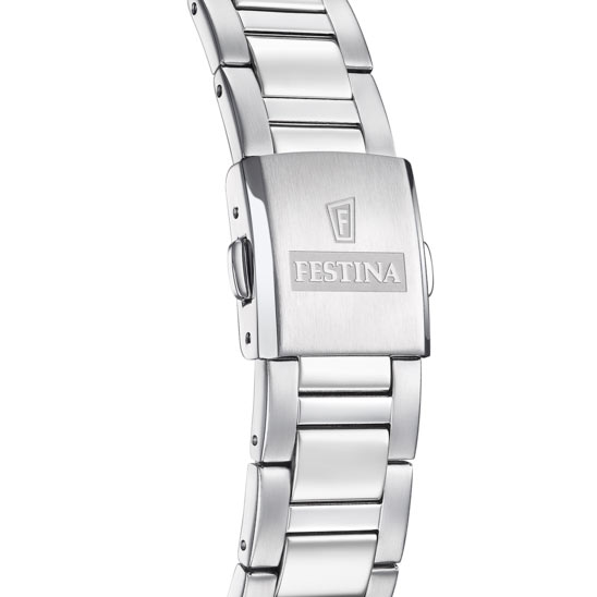 Festina Petite Solar Energy to solarny zegarek męski wykonany ze stali nierdzewnej 316L. Dzięki zawartości molibdenu stal klasy 316L zapewnia znacznie większą odporność na korozję niż stal niższego gatunku. Koperta ma średnicę 41,5 mm. Trzyrzędowa bransoleta jest zapinana na dwa przyciski, dzięki czemu czasomierz nie spadnie z nadgarstka tuż po rozpięciu. Elegancka tarcza o szlifowanym i satynowym wykończeniu została zabezpieczona szkłem mineralnym. Starannie nałożone na nią indeksy, cyfry arabskie oraz wskazówki gwarantują doskonały stopień czytelności. Natomiast przy niedostatecznej ilości światła jej poziom utrzymywany jest przez materiał luminescencyjny. Srebrny zegarek męski na bransolecie Festina Petite cechuje wygląd w stylu klasycznym. Stoją za nim: ponadczasowa forma i kolorystyka, a także wysoka jakość materiałów i wykończeń.