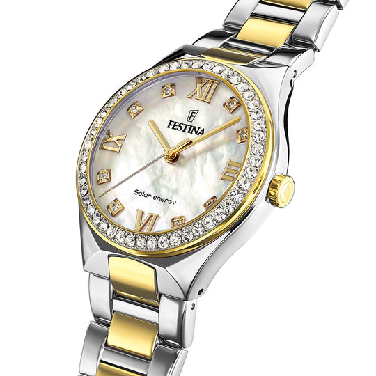 Solarny zegarek damski bicolor w stylu biżuteryjnym Festina Solar Energy. Idealny dodatek dla eleganckich Pań wyznających nowoczesne podejście do życia.