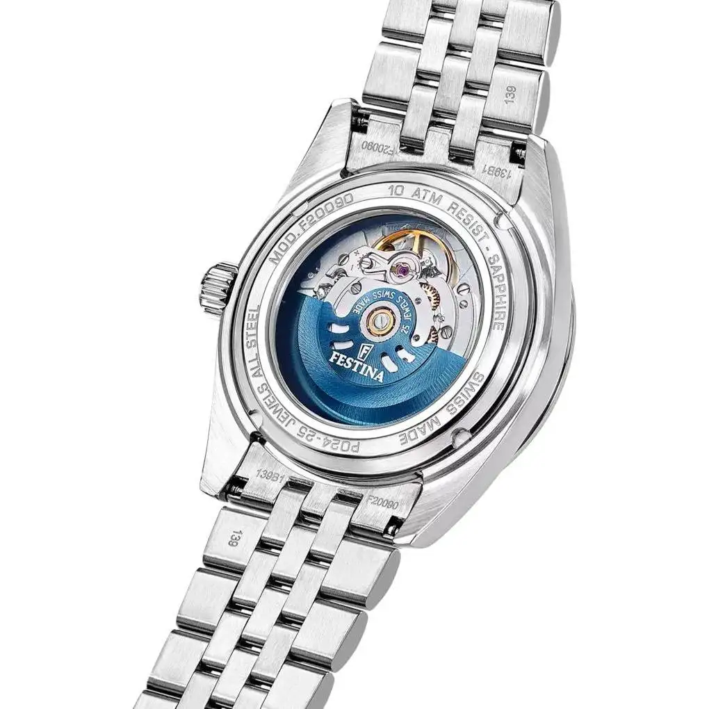 Czasomierz Festina Automatic łączy elegancki wygląd z praktycznymi rozwiązaniami konstrukcyjnymi. Szafirowe szkło skutecznie chroni tarczę przed zarysowaniami, a wodoszczelność do 10 ATM pozwala bez obaw korzystać z zegarka podczas codziennych aktywności. To solidny, czytelny i precyzyjny zegarek dla mężczyzn, którzy oczekują od czasomierza zarówno niezawodności, jak i klasycznego stylu Swiss Made.