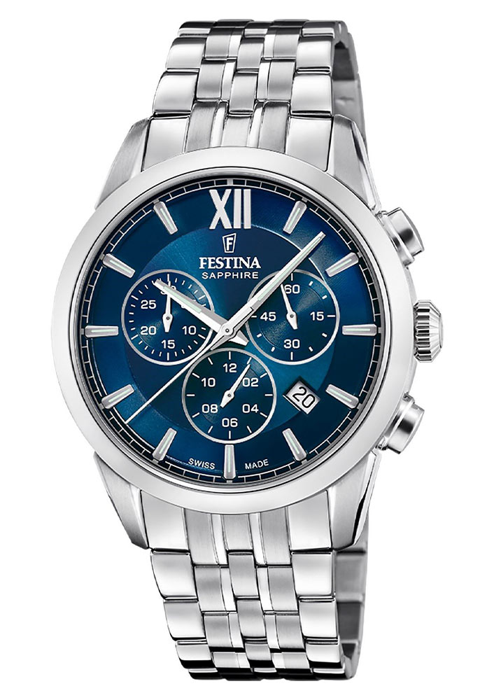 Szkło szafirowe chroni tarczę z niebieskim tłem. Wyraźne wskazówki z masą luminescencyjną zapewniają czytelność w każdych warunkach. Tarcza wzbogacona została o liczniki chronografu. Hiszpański czasomierz Festina chwali się swoją funkcjonalnością. Chronograf pomoże zmierzyć dokładny czas na przykład w czasie aktywności fizycznej. W prezentowanym modelu nie zabrakło miejsca dla datownika. Okno między godziną czwartą i piątą informuje o aktualnym dniu miesiąca. Pod tarczą zainstalowany został szwajcarski mechanizm Ronda swiss made, który zasilany jest baterią. Jest to dokładny układ, który nie zawiedzie swojego właściciela.