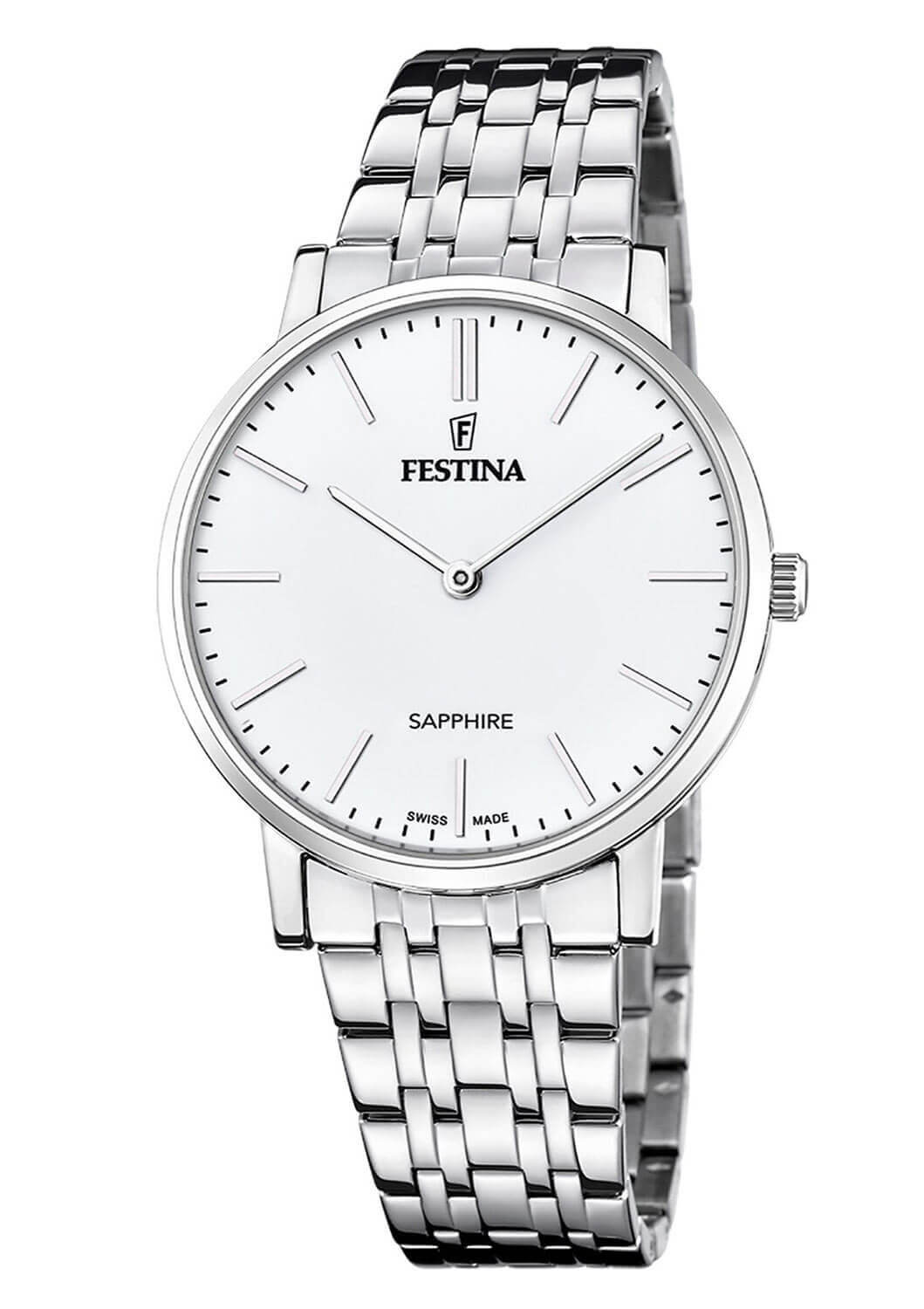 Model ten wykonano z najwyższej jakości materiałów, co gwarantuje jego trwałość i niezawodność. Koperta o kompaktowej średnicy 39.30 mm jest wykonana ze stali szlachetnej klasy 316L, znanej ze swojej odporności na korozję oraz eleganckiego wykończenia. Zegarek Festina Swiss Made wyposażono w szkło szafirowe, które charakteryzuje się niezwykłą twardością i odpornością na zarysowania, co zapewnia doskonałą ochronę tarczy przez długie lata. Całość dopełnia stalowa bransoleta z zapięciem motylkowym, które nie tylko zwiększa wygodę noszenia, ale także dodaje modelowi wyrafinowanego charakteru.