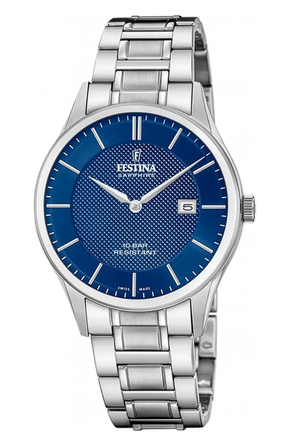 Stylowy zegarek męski Festina na stalowej bransolecie. Giloszowana tarcza w kolorze niebieskim. Koperta wyposażona w trudne do zarysowania szkło szafirowe. Model napędzany przez szwajcarski mechanizm Ronda z datownikiem. Zegarek doskonały na każdą okazję — można z nim pływać dzięki klasie szczelności do 100 metrów.