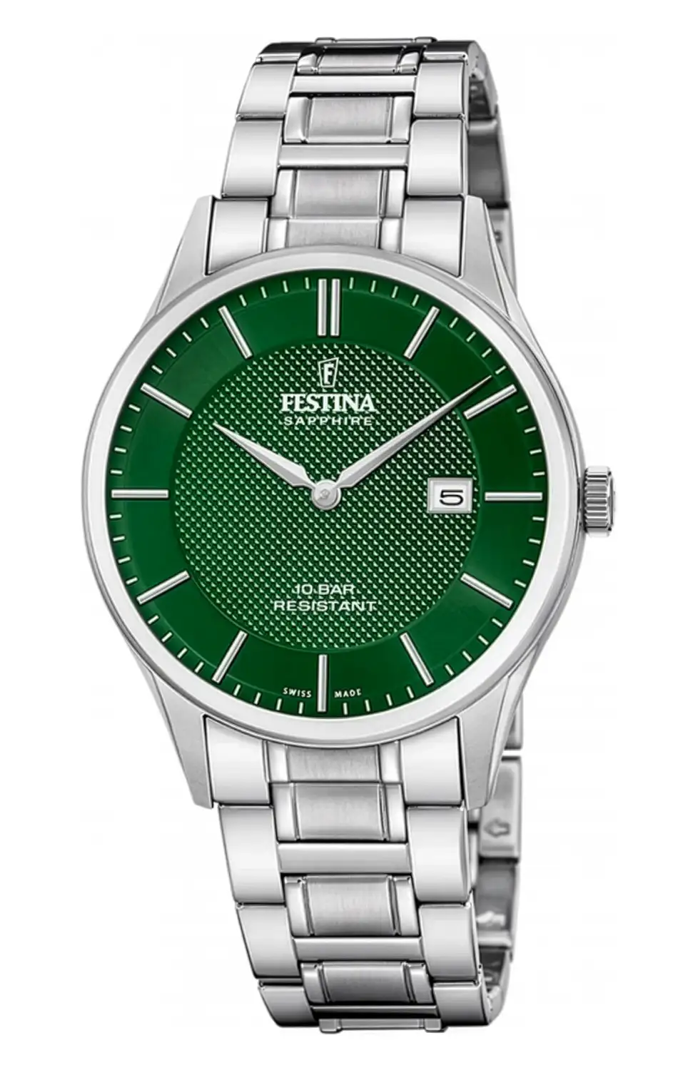 Tarcza w subtelnym, butelkowozielonym odcieniu została ozdobiona giloszowaniem, które nadaje jej wyjątkowego charakteru. Wyraźne, srebrne indeksy godzinowe i wskazówki podkreślają elegancję, a jednocześnie zapewniają czytelność. Funkcjonalność czasomierza Festina wzbogaca datownik umieszczony na godzinie trzeciej, idealny dla osób ceniących praktyczne rozwiązania. Prezentowany zegarek męski Festina Swiss Made Quartz F200675 napędzany jest przez szwajcarski mechanizm Ronda, którego precyzja nie zawiedzie swojego właściciela.