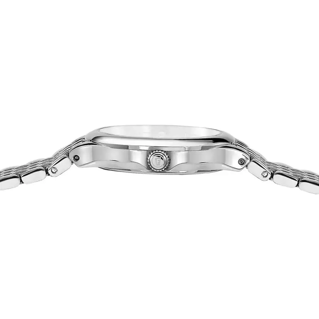 Stalowa bransoleta o drobnych ogniwach płynnie przechodzi w kopertę, tworząc spójną i komfortową konstrukcję, a zapięcie motylkowe zapewnia wygodę oraz estetyczne wykończenie bez widocznych elementów. Szafirowe szkło chroni tarczę przed zarysowaniami, dzięki czemu zegarek zachowuje swój nienaganny wygląd przez długi czas. W środku obudowy zainstalowany jest szwajcarski mechanizm Ronda, który gwarantuje bardzo dobre odmierzanie czasu. To klasyczny, kobiecy model Swiss Made, który łączy precyzję wykonania z ponadczasowym stylem i naturalną lekkością noszenia.