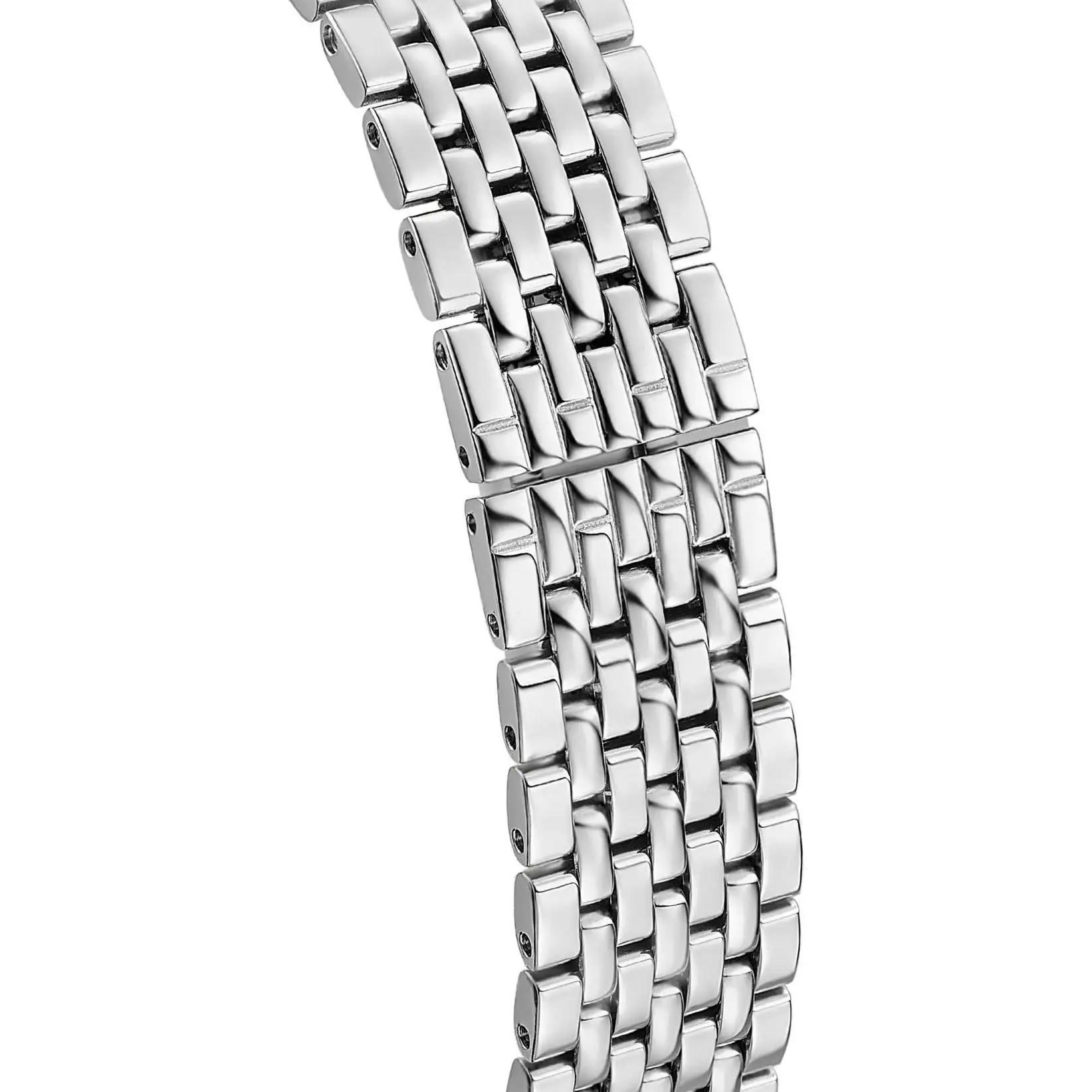 Stalowa bransoleta o drobnych ogniwach płynnie przechodzi w kopertę, tworząc spójną i komfortową konstrukcję, a zapięcie motylkowe zapewnia wygodę oraz estetyczne wykończenie bez widocznych elementów. Szafirowe szkło chroni tarczę przed zarysowaniami, dzięki czemu zegarek zachowuje swój nienaganny wygląd przez długi czas. W środku obudowy zainstalowany jest szwajcarski mechanizm Ronda, który gwarantuje bardzo dobre odmierzanie czasu. To klasyczny, kobiecy model Swiss Made, który łączy precyzję wykonania z ponadczasowym stylem i naturalną lekkością noszenia.