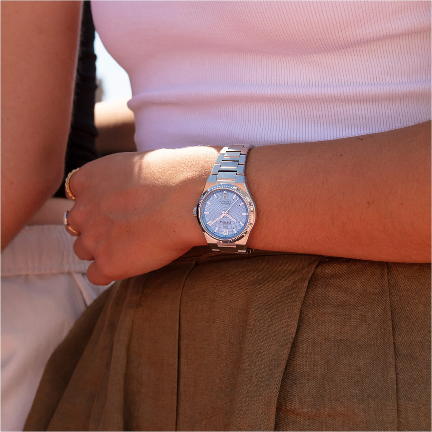 Okrągła koperta wykonana ze stali nierdzewnej ma kompaktowy rozmiar 35 mm, co zapewnia elegancję i trwałość na długie lata. Kolekcja Rivé została zaprojektowana z myślą o ponadczasowym stylu. Zegarek damski Festina Rivé, dzięki smukłej konstrukcji o grubości nieprzekraczającej 9 mm, nie tylko prezentuje się luksusowo, ale także wygodnie ułoży się na nadgarstku. Model ten zestawiono ze stalową bransoletę z bezpiecznym zapięciem motylkowym na zatrzask, co ułatwia codzienne użytkowanie. Obudowa zegarka, z klasą szczelności do 100 metrów, pozwala na korzystanie z niego podczas sportów wodnych, takich jak pływanie.