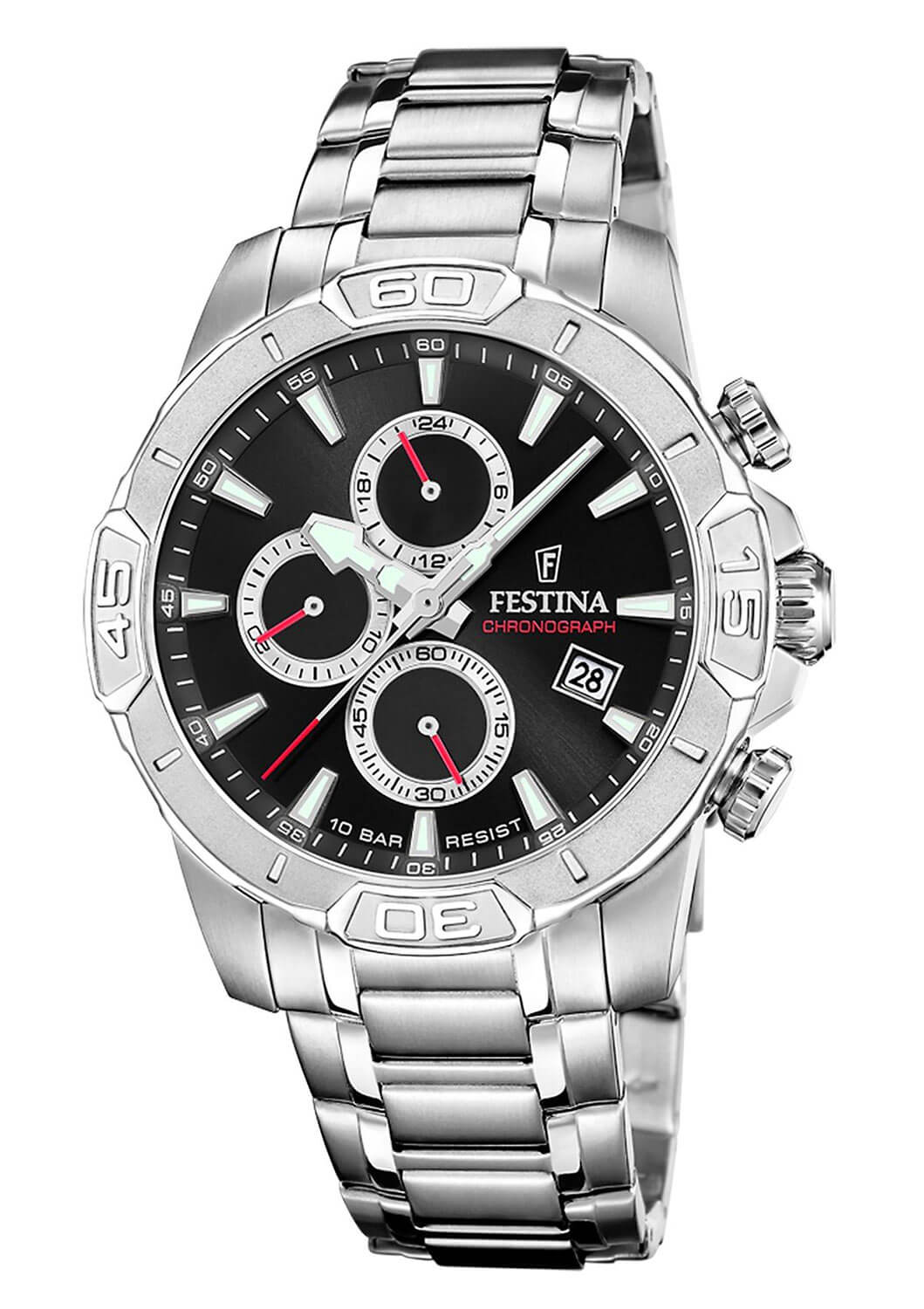 Czarna tarcza zegarka Festina Timeless Chronograph przyciąga uwagę swoją czytelnością i funkcjonalnością. Znajdują się na niej subtarcze, które umożliwiają korzystanie z zaawansowanych funkcji chronografu, takich jak pomiar czasu z dokładnością do sekund. Zegarek oferuje również funkcje datownika z aktualnym dniem miesiąca oraz tarcze do wskazywania pory dnia w formacie 12/24-godzinnym, co ułatwia orientację w czasie. Subtelne detale, takie jak czerwone akcenty na wskazówkach i eleganckie indeksy, nadają mu sportowego charakteru, który wyróżnia się na tle klasycznych modeli. To idealny wybór dla mężczyzn, którzy poszukują zegarka łączącego estetykę z praktycznością.