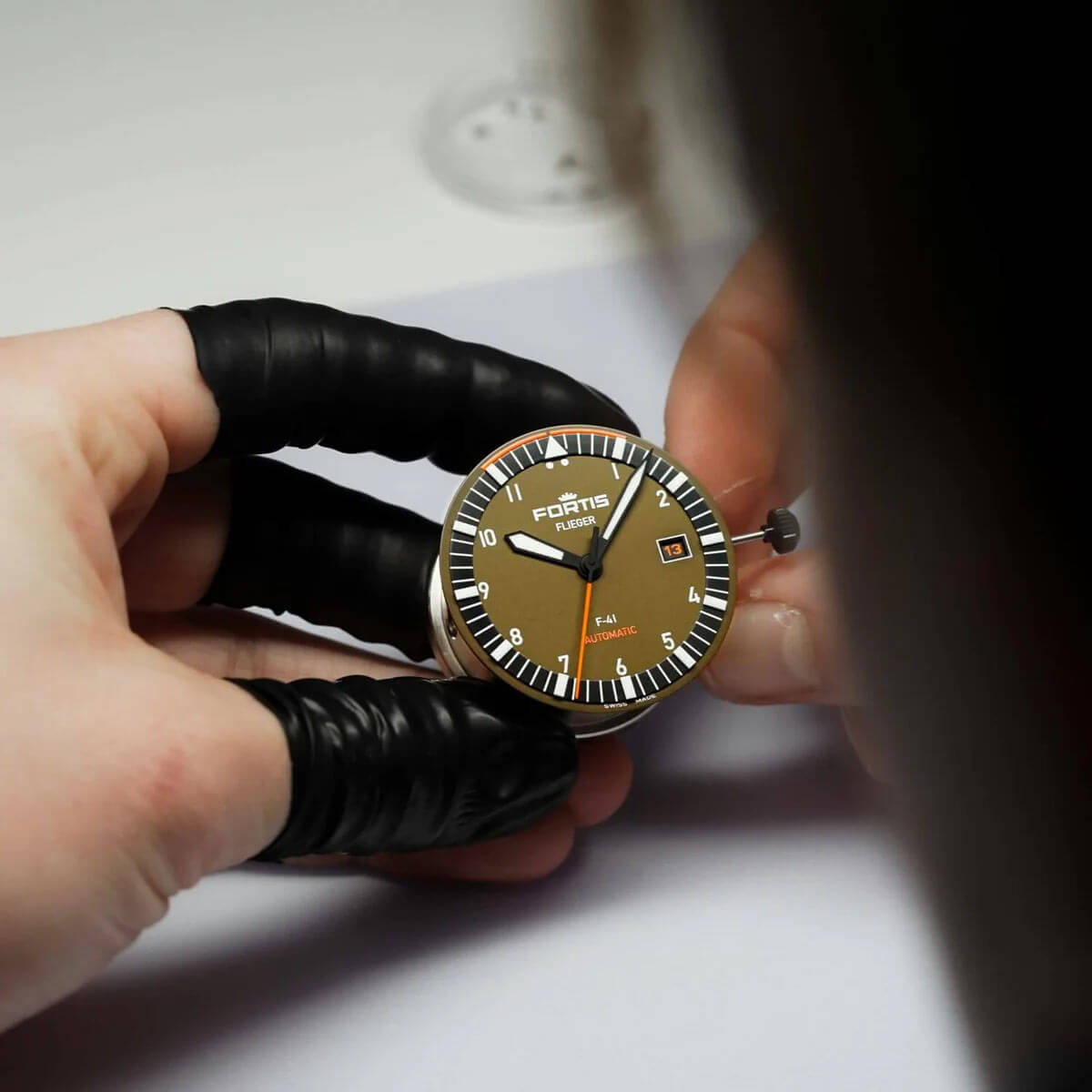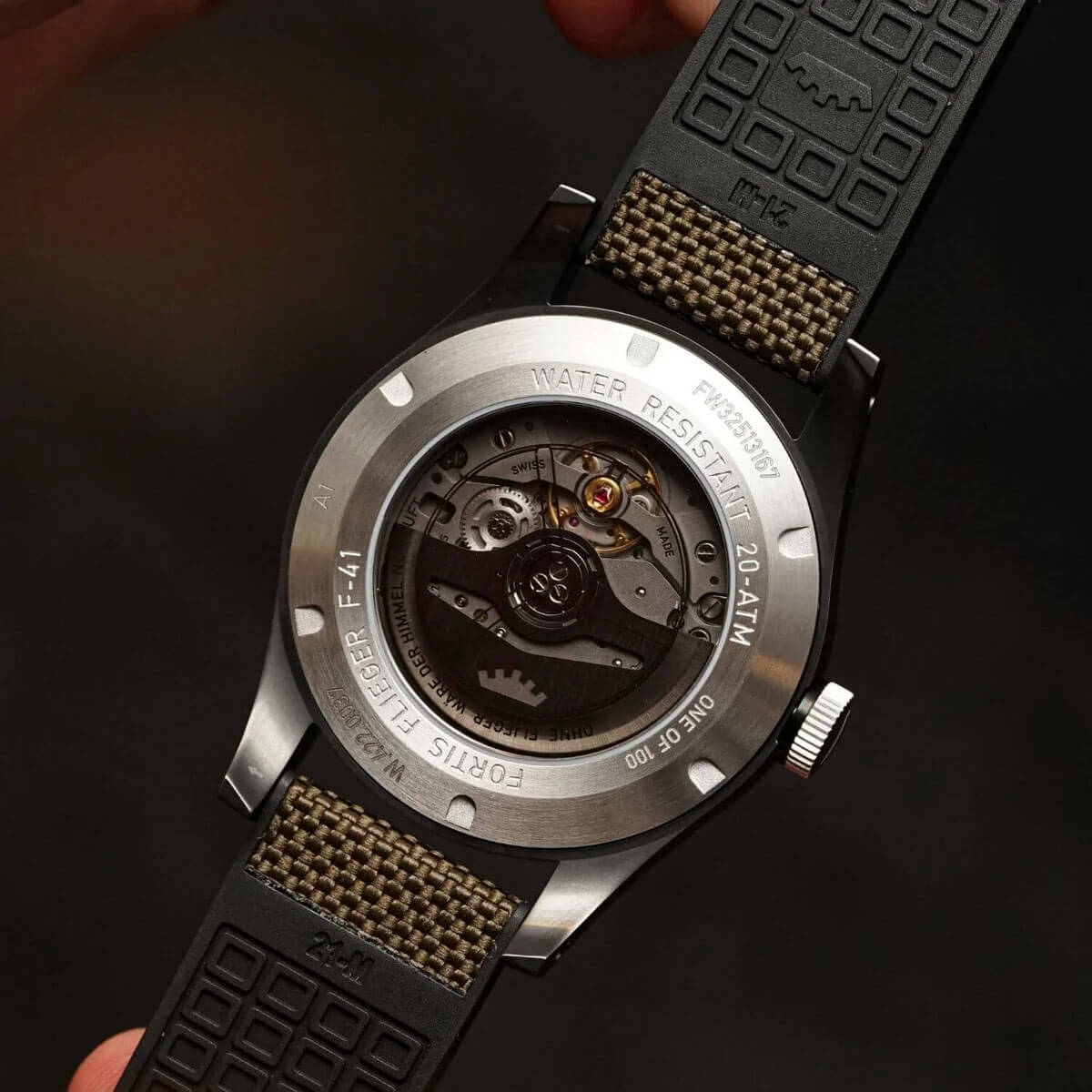 Koperta o średnicy 41 mm została wykonana z piaskowanej stali szlachetnej pokrytej czarną powłoką DLC – matową, odporną na refleksy i uszkodzenia. W połączeniu z zakręcaną koronką i zakręcanym deklem tworzy wytrzymałą, szczelną konstrukcję o klasie szczelności 200 metrów (20 ATM). Koronka wyposażona jest w specjalny system uszczelek wykończony wytrzymałą gumą FKM. Model ten zestawiony jest z hybrydowym paskiem — górna część to materiał tekstylny, a dolna to guma FKM. Zielono-oliwkowa tarcza z wyraźnymi indeksami pokrytymi powłoką Brixtrack® i pomarańczową wskazówką sekundnika zachowuje idealną czytelność niezależnie od warunków, a szkło szafirowe z podwójną powłoką antyrefleksyjną gwarantuje pełną przejrzystość nawet w ostrym świetle. Pod tarczą mieści się wyjątkowy mechanizm automatyczny. Manufakturowy WERK 7 z rezerwą chodu do 70 godzin stworzony został specjalnie dla Fortis przez renomowana markę La Joux-Perret. Układ ten gwarantuje doskonałą pracę wskazań — to niezawodny mechanizm, który nie zawiedzie swojego właściciela.