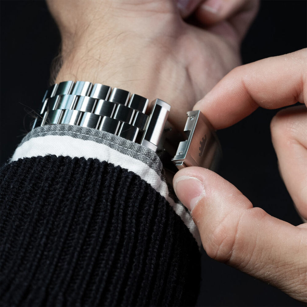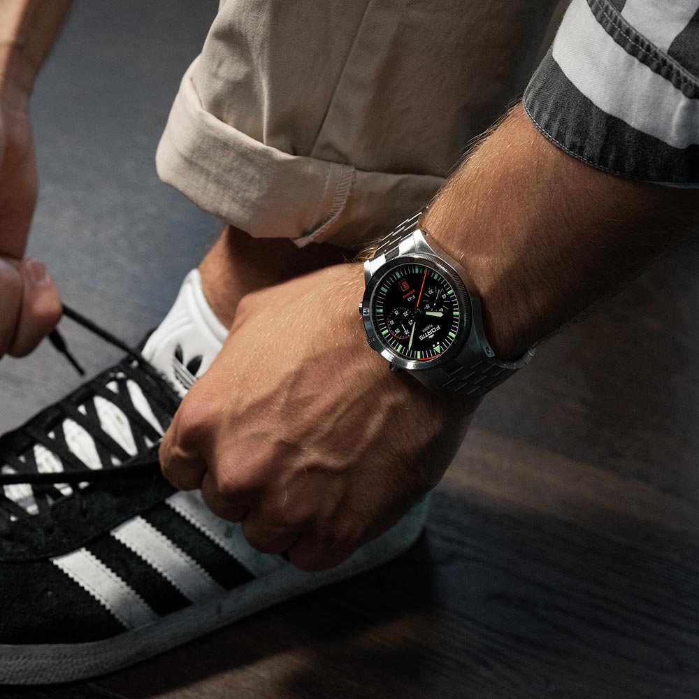 Wytrzymała i odporna obudowa wykonana jest z jednako wyśmienitej stali szlachetnej, jedynie w aktualnym rozmiarze i zawieszona na bransolecie z blokadą ze specjalnym zapięciem suwakowym. Zapięcie to ma precyzyjny system przesuwania, dzięki któremu można uzyskać spersonalizowane położenie bransolety. Tarcza, przykryta przezroczystym i nierysującym się szkłem szafirowym z antyrefleksem po obu stronach, ponownie imponuje gabarytem. Posiada czytelne cyfry i indeksy, wskazówki w rodzaju miecza, kultowy, neonowo-pomarańczowy sekundnik, a trójkątowi przy godzinie 12 towarzyszą 2 kropki, podbudowujące czytelność. To zegarek dla podróżników, uwielbiany przez pilotów z całego świata, profesjonalistów i amatorów.
