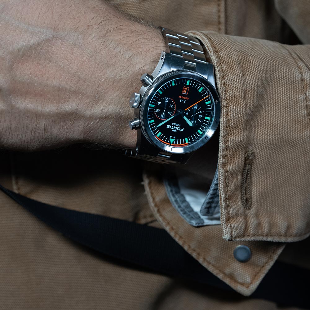 Fortis Flieger F-43 Bicompax F4240004 odznacza się silnymi kontrastami. To po równo dodatek na co dzień, jak i zegarek narzędziowy. Jego barwa, to nie kolor, a funkcja. Pomarańczowy nigdy nie jest stylowy, on zawsze jest funkcjonalny. Stal - zielony - pomarańczowy po dziś dzień to właściwości jedynego, prawdziwego „FLIEGERA” - pioniera światowej definicji zegarków pilotażowych i nawet do dziś stanowi on punkt odniesienia dla gros naśladowców. Na pomarańczowe (Berlac Fluor Orange) elementy zaaplikowana została technologia Brixtrack®, zapewniająca "czytelność w ułamku sekundy", a na zielone - bardzo jasna Superluminova® X1. Niezależnie od tego gdzie się znajdziesz o późnej porze, nigdy nie stracisz poczucia czasu!