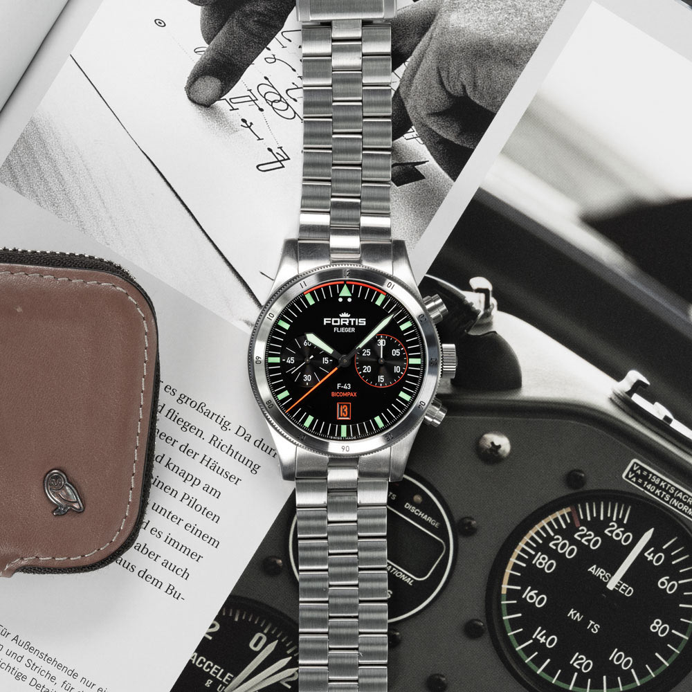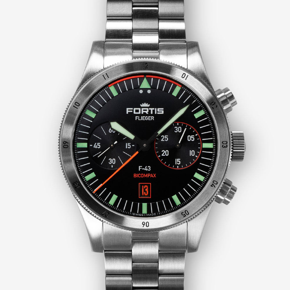 "To nie zegarek typu pilot. To kawałek czasu". Zegarek męski Fortis Flieger F-43 Bicompax F4240004 nie jest stworzony na nowo, tylko lepiej niż kiedykolwiek wcześniej. Flieger F-43 Bicompax posiada charakterystyczny design inspirowany pierwszym modelem lotniczym z kolekcji Flieger z 1987 roku. Cechą szczególną mechanizmu UW-51 (baza - Sellita SW510) jest chronograf z tylko jednym licznikiem, ograniczającym zbędną według twórców złożoność cyferblatu i tym samym przyspieszającym prędkość jego czytania.