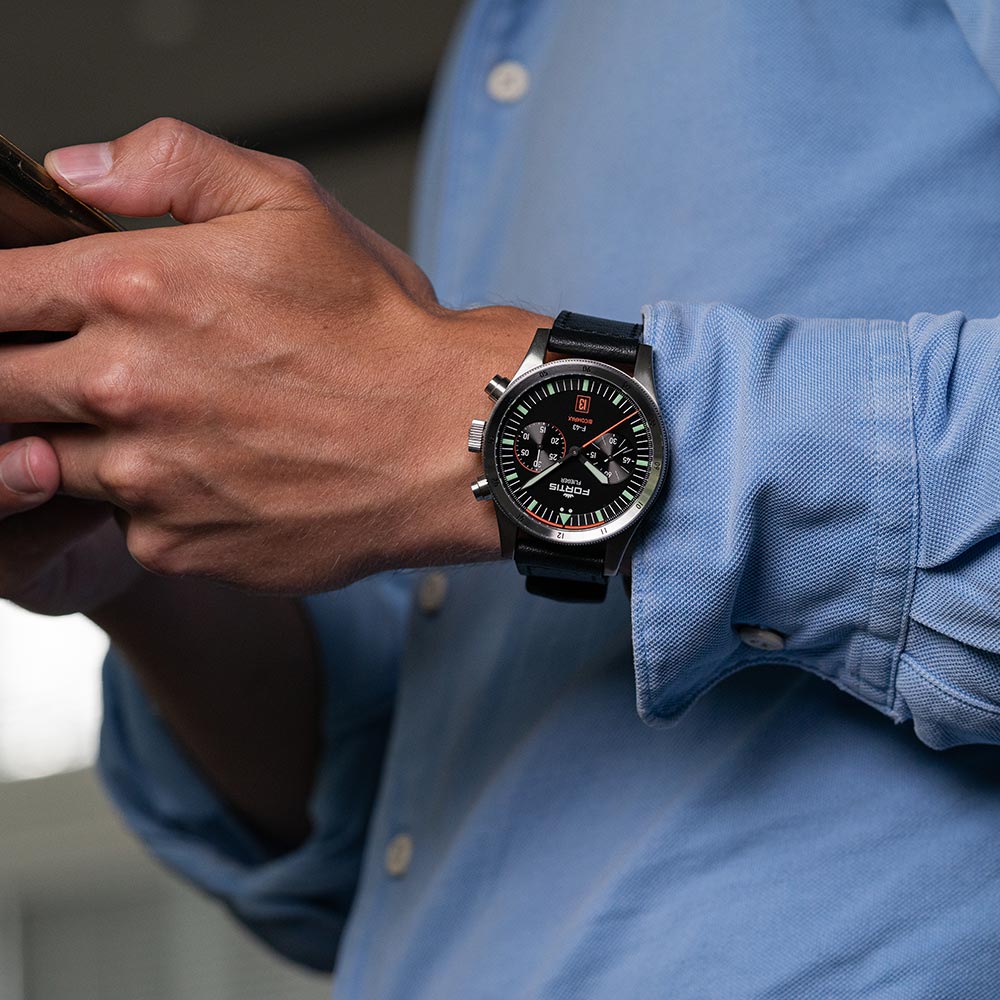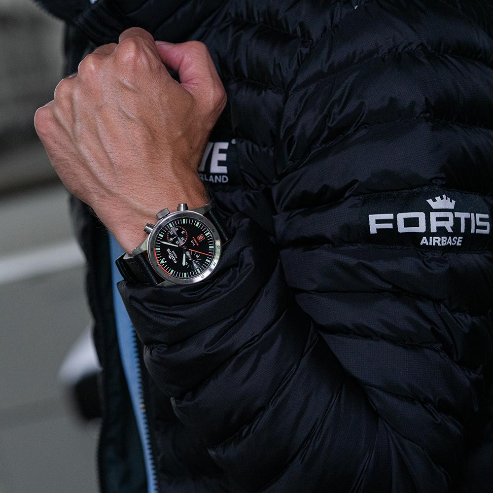 Fortis Flieger F-43 Bicompax F4240005 odznacza się silnymi kontrastami. To po równo dodatek na co dzień, jak i zegarek narzędziowy. Jego barwa, to nie kolor, a funkcja. Pomarańczowy nigdy nie jest stylowy, on zawsze jest funkcjonalny. Stal — zielony - pomarańczowy po dziś dzień to właściwości jedynego, prawdziwego „FLIEGERA” - pioniera światowej definicji zegarków pilotażowych i nawet do dziś stanowi on punkt odniesienia dla gros naśladowców. Na pomarańczowe (Berlac Fluor Orange) elementy zaaplikowana została technologia Brixtrack®, zapewniająca "czytelność w ułamku sekundy", a na zielone - bardzo jasna Superluminova® X1. Niezależnie od tego gdzie się znajdziesz o późnej porze, nigdy nie stracisz poczucia czasu!