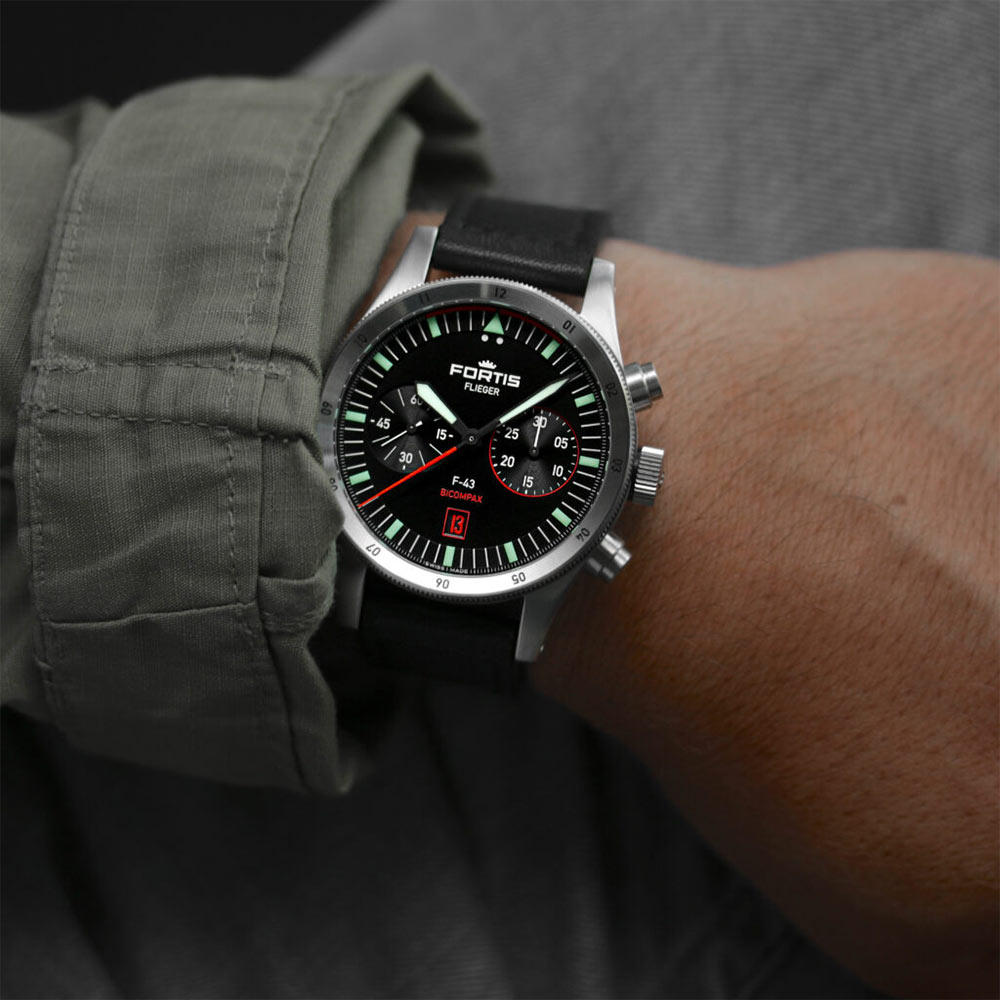 "To nie zegarek typu pilot. To kawałek czasu". Zegarek męski Fortis Flieger F-43 Bicompax F4240005 nie jest stworzony na nowo, tylko lepiej niż kiedykolwiek wcześniej. Flieger F-43 Bicompax posiada charakterystyczny design inspirowany pierwszym modelem lotniczym z kolekcji Flieger z 1987 roku. Z tego powodu, produkt ten jest szczególnie lubiany i doceniany przez fanów zegarków lotniczych luftwaffe.