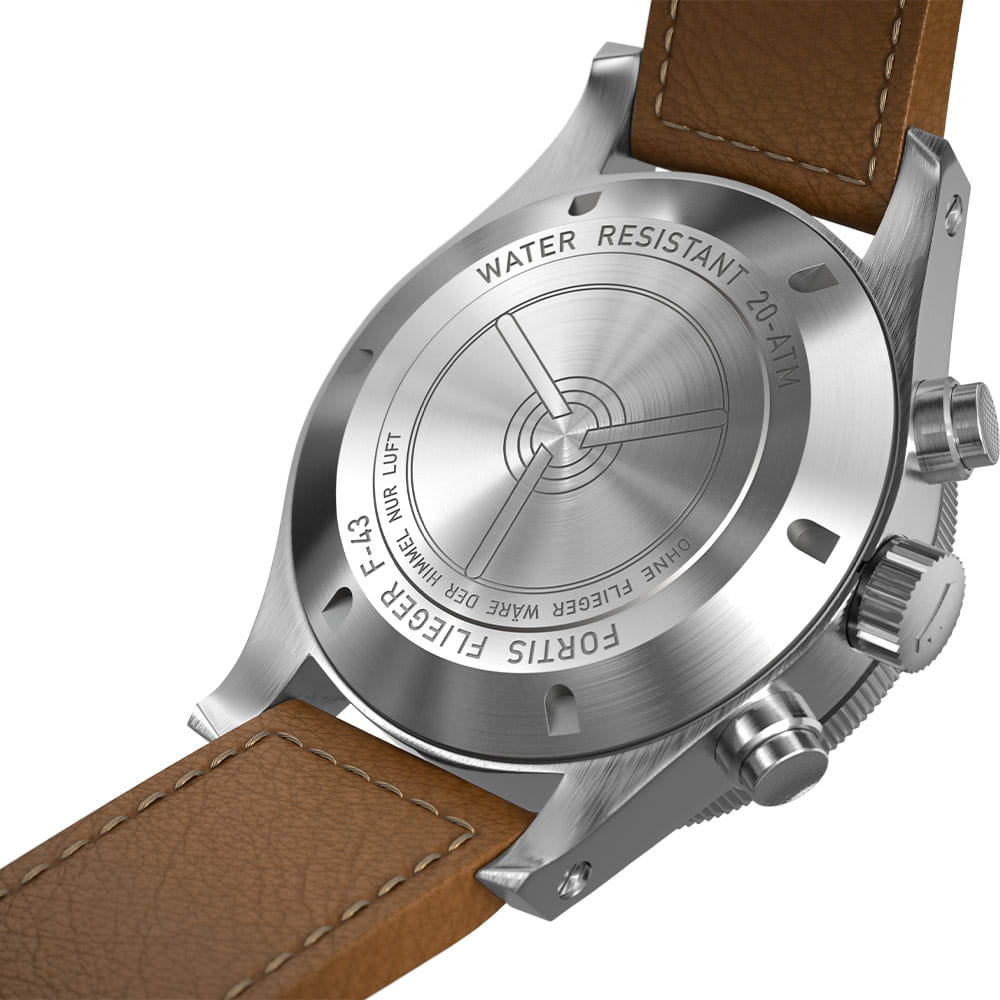Męski zegarek Fortis F4240013 to ekologiczna 43 mm obudowa, która wykonana została ze stali recyklingowej w kolorze srebrnym. Jest to świetny przykład jak walczyć o zdrowie naszej planety. Zegarek uszczelniony został do 200 metrów, co pozwala na nurkowanie bez obawy o uszkodzenie mechanizmu. Zakręcana koronka z potrójnym systemem uszczelek oraz zakręcany dekiel to dodatkowe zapewnienie szczelności tego czasomierza. Na froncie znalazł się jednokierunkowy bezel z drugą 12-godzinną strefą czasową GMT z 24 klikami, który pozwala na szybką zmianę strefy już jednym obrotem. Do uszu obudowy przymocowany został elegancki pasek ze skóry w kolorze brązowym. Miękkość i niska waga paska zapewni wysoki komfort w czasie użytkowania czasomierza.