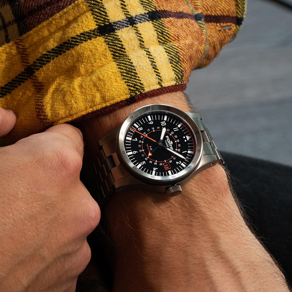 Fortis Flieger F-43 Triple-GMT F4260000 odznacza się silnymi kontrastami. To po równo dodatek na co dzień, jak i zegarek narzędziowy. Jego barwa, to nie kolor, a funkcja. Pomarańczowy nigdy nie jest stylowy, on zawsze jest funkcjonalny. Stal - zielony/niebieski - pomarańczowy po dziś dzień to właściwości jedynego, prawdziwego „FLIEGERA” - pioniera światowej definicji zegarków pilotażowych i nawet do dziś stanowi on punkt odniesienia dla gros naśladowców. Na pomarańczowe (Berlac Fluor Orange) elementy zaaplikowana została technologia Brixtrack®, zapewniająca "czytelność w ułamku sekundy", a na niebieskie — bardzo jasna Superluminova® X1. Niezależnie od tego gdzie się znajdziesz o późnej porze, nigdy nie stracisz poczucia czasu!