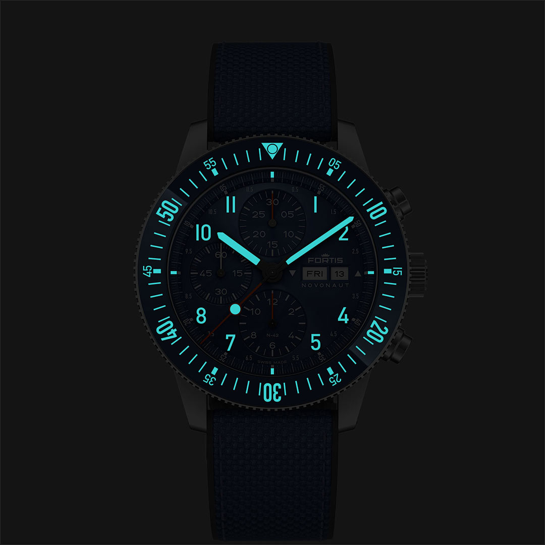 Bezel wykonany z ceramiki jest nie tylko atrakcyjny, ale i odporny, a połączony z materiałem świetlnym czyni ten zegarek narzędziowy idealnym kompanem każdego wyzwania, w dzień i w nocy. W każdym egzemplarzu modelu Fortis Novonaut zastosowano manufakturowy mechanizm automatyczny z kołem kolumnowym — WERK 17, którego wytrzymałość testowano w stratosferze. Zegarek męski z chronografem i datownikiem napędza więc technologia odporna na mikrograwitację, ekstremalne temperatury, promieniowanie, mikro gęstość, a także porywisty wiatr do 250 km/h. Rezerwa chodu kalibru Fortis WERK 17 wynosi około 60 godzin.