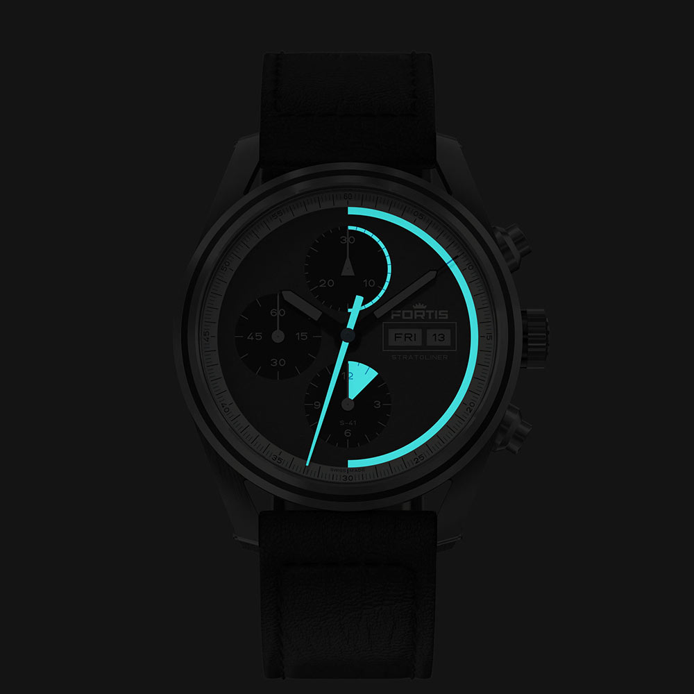Co więcej, najnowszy Stratoliner jest wyposażony w mechanizm automatyczny z chronografem — WERK 17, który jako pierwszy kaliber manufakturowy został przetestowany w otwartej stratosferze. WERK 17 odbył podróż do stratosfery i z powrotem na Ziemię, aby udowodnić swoją bezkonkurencyjną solidność. Jego koło kolumnowe jest nieprzeciętnie wytrzymałe, a rezerwa chodu wynosi aż 60 godzin. To jedyny zegarek "odporny na kosmos". Na krawędzi dekla umieszczono poświadczenie producenta: "Space Resistant 20 ATM". Konstrukcję mechanizmu Fortis WERK 17 można z zachwytem podziwiać przez ekskluzywny dekiel z przydymionego szkła szafirowego. Kolejnych, wyjątkowych wrażeń dostarcza okrągłe okno, przypominające to w statku kosmicznym. Dzięki niemu użytkownik zyskuje unikalną okazję do wglądu do zegarmistrzowskiego mikrokosmosu.