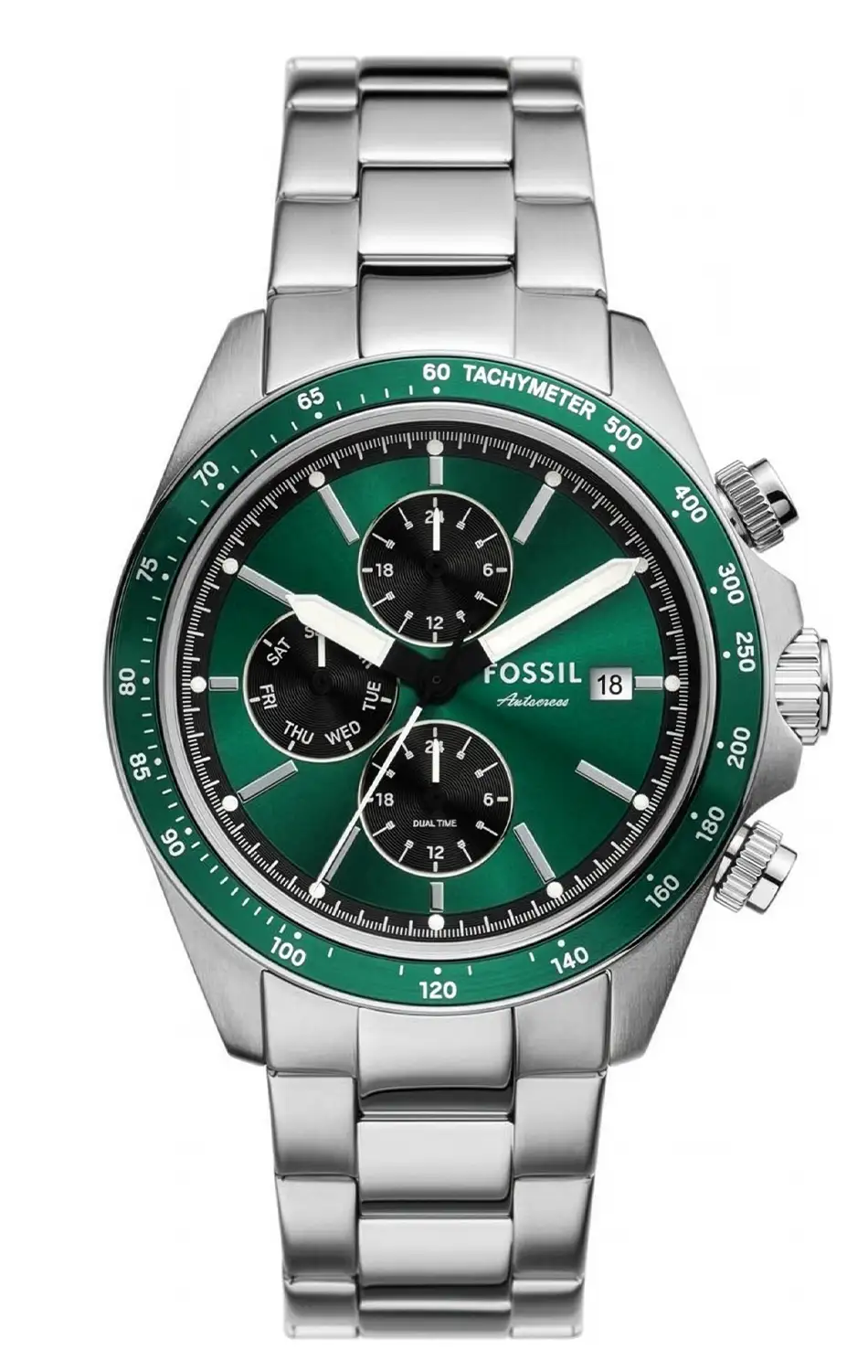 Zegarek męski Fossil to sportowy chronograf z kopertą 44 mm i srebrną bransoletą, inspirowany motorsportem, łączący wyrazisty design z funkcjami tachymetru i stopera do codziennego użytkowania.