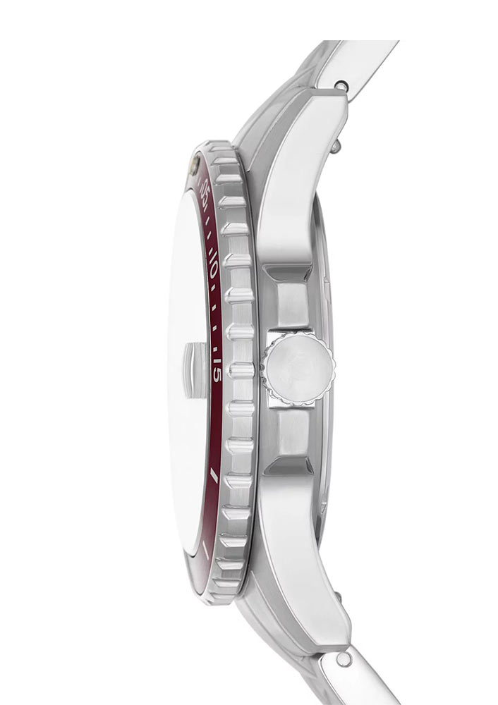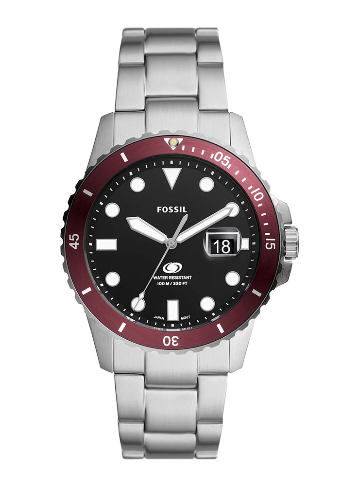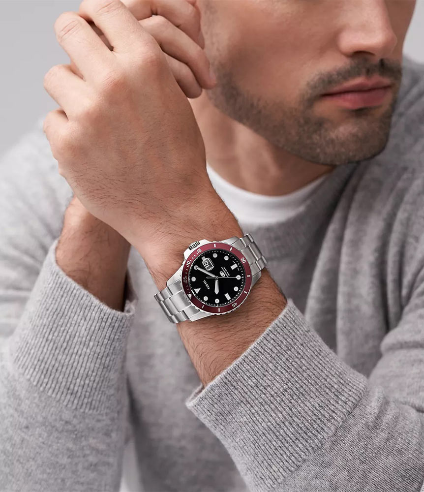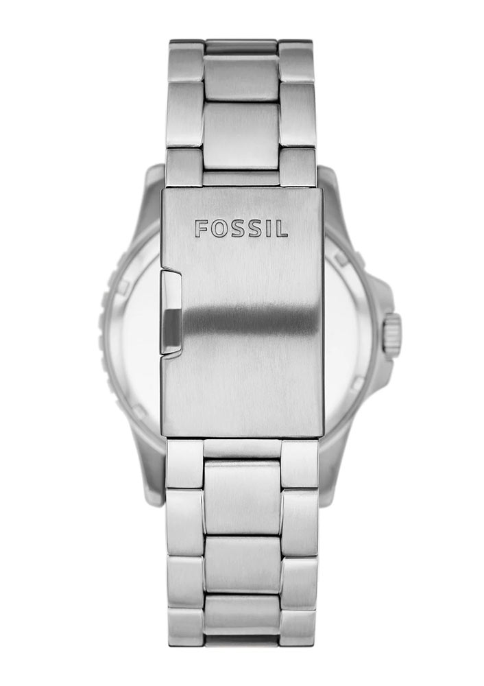 Okrągła obudowa w męskim rozmiarze 42 mm wykonana ze stali szlachetnej klasy 316L uszczelniona została do 100 metrów. Wodoszczelność 10 bar pozwala na pływanie z zegarkiem bez obawy o jego uszkodzenie. Na froncie obudowy znalazła się obrotowa jednokierunkowa luneta. Na niej umieszczona została specjalna skala, która w połączeniu ze wskazówką minutową pomoże łatwiej kontrolować upływający czas w minutach. Na odwrocie obudowy umieszczony jest zakręcany dekiel, który jest wsparciem szczelności zegarka. Duża i wygodna w obsłudze koronka znajduje się po prawej stronie koperty. Producent swój zegarek sportowy Fossil zestawił ze stalową bransoletą. Wyposażona jest w bezpieczne i komfortowe zapięcie motylkowe.