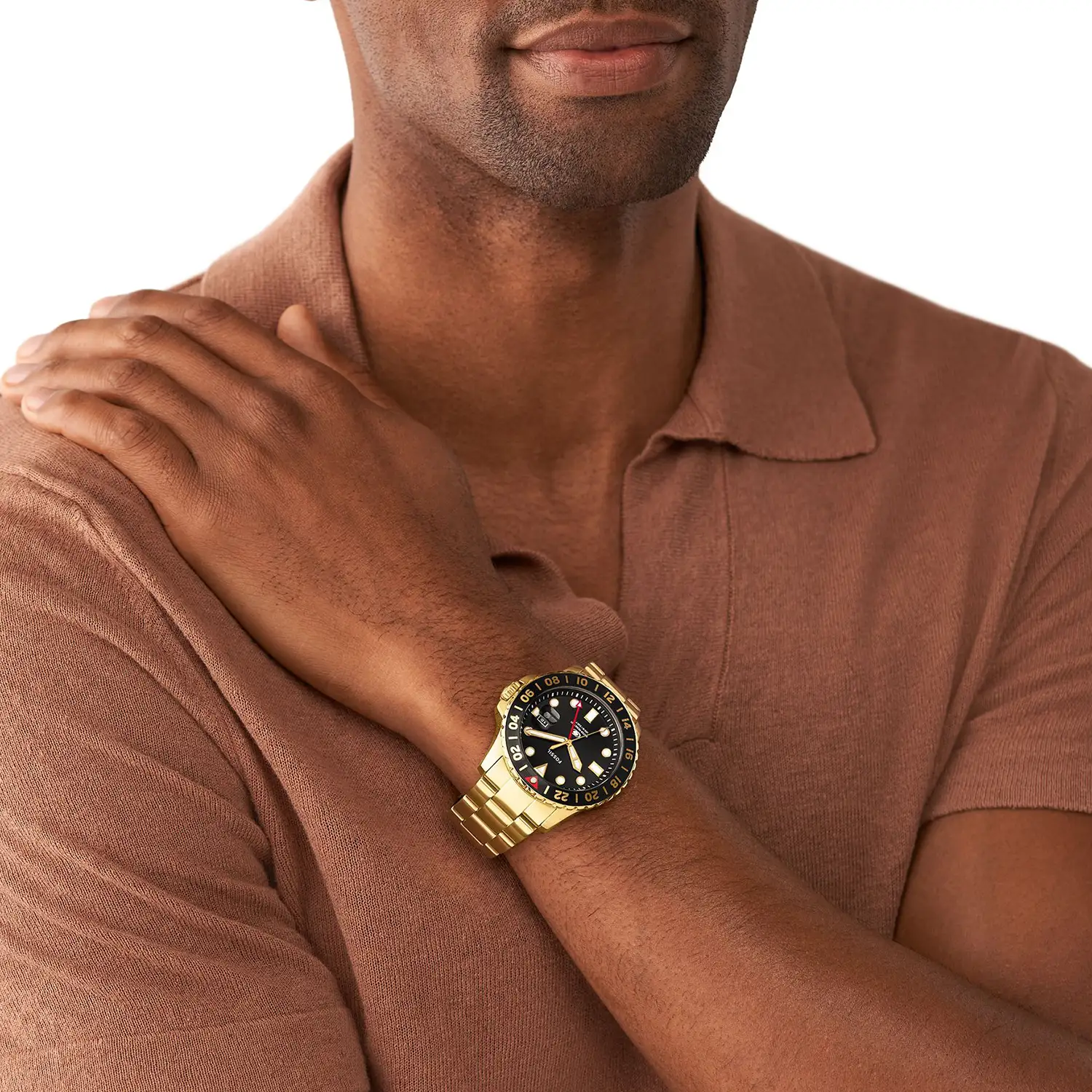 Pozłacany zegarek męski Fossil Blue GMT FS5990 to masywna propozycja inspirowana stylistyką diverów, zaprojektowana z myślą o wyrazistym wyglądzie i wysokiej czytelności. Koperta w kolorze złotym o średnicy 46 mm nadaje mu zdecydowanego, sportowego charakteru, a czarna tarcza z kontrastowymi indeksami i wskazówkami sprawia, że czas odczytasz bez wysiłku w każdych warunkach. Całość uzupełnia solidna, pozłacana bransoleta FOSSIL z zapięciem motylkowym, która podkreśla silny, outdoorowy styl modelu.