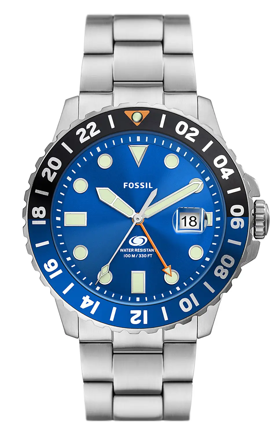 Zegarek męski Fossil Blue GMT FS5991 to masywna propozycja inspirowana stylistyką diverów, zaprojektowana z myślą o wyrazistym wyglądzie i wysokiej czytelności. Koperta o średnicy 46 mm nadaje mu zdecydowanego, sportowego charakteru, a niebieska tarcza z kontrastowymi indeksami i wskazówkami sprawia, że czas odczytasz bez wysiłku w każdych warunkach. Całość uzupełnia solidna, srebrna bransoleta, która podkreśla silny, outdoorowy styl modelu.
