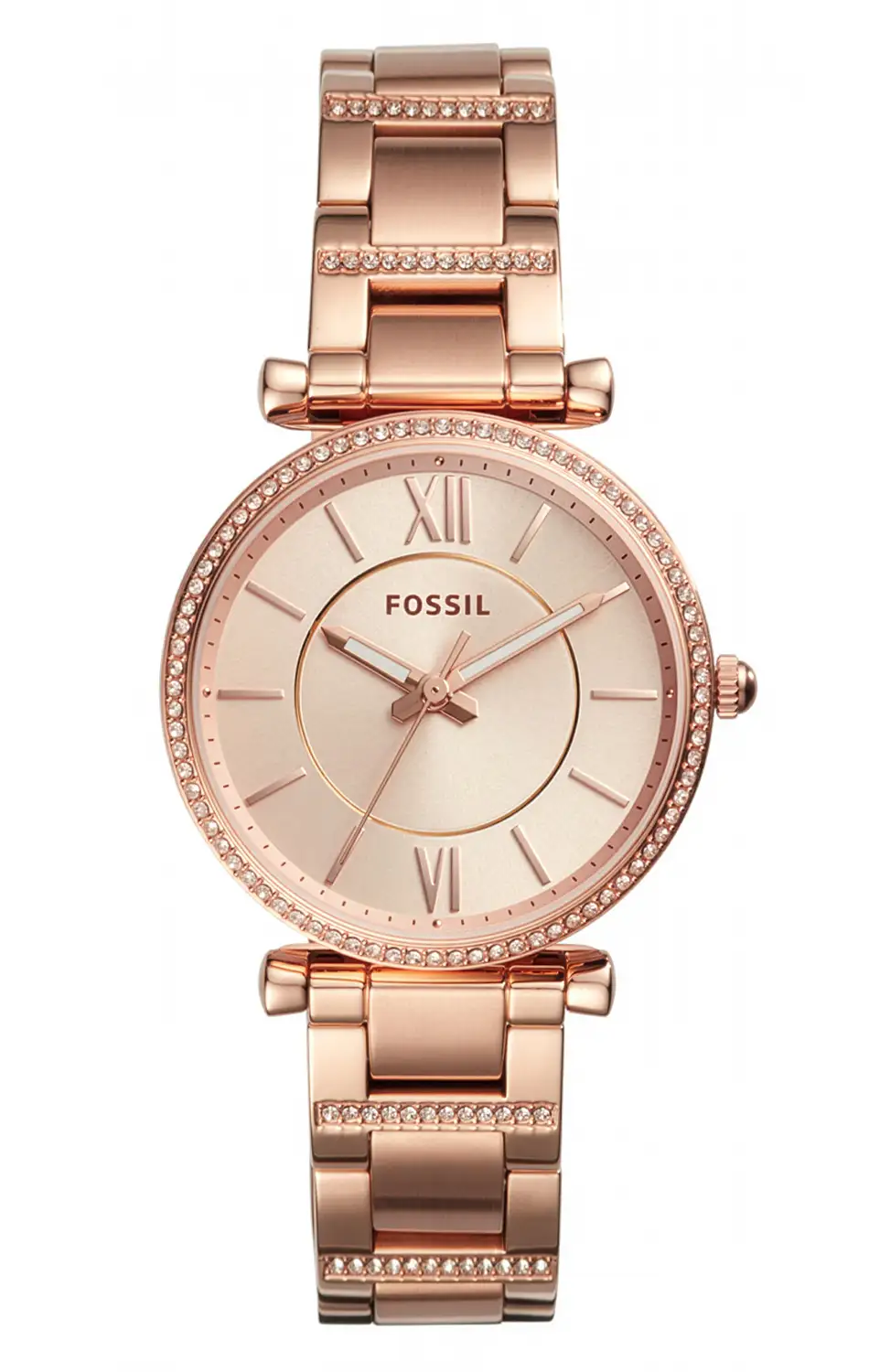 Zegarek damski Fossil Carlie ES4301 w różowo-złotej odsłonie to propozycja dla kobiet, które cenią biżuteryjny charakter dodatków i subtelną elegancję w nowoczesnym wydaniu. Koperta o średnicy 35 mm została wykończona ciepłą powłoką rose gold i ozdobiona kryształkami, które delikatnie okalają tarczę, nadając całości wyrafinowany blask bez efektu przesady. Jasna tarcza z czytelnymi indeksami i smukłymi wskazówkami tworzy harmonijną kompozycję, idealną zarówno do codziennych stylizacji, jak i bardziej eleganckich okazji.