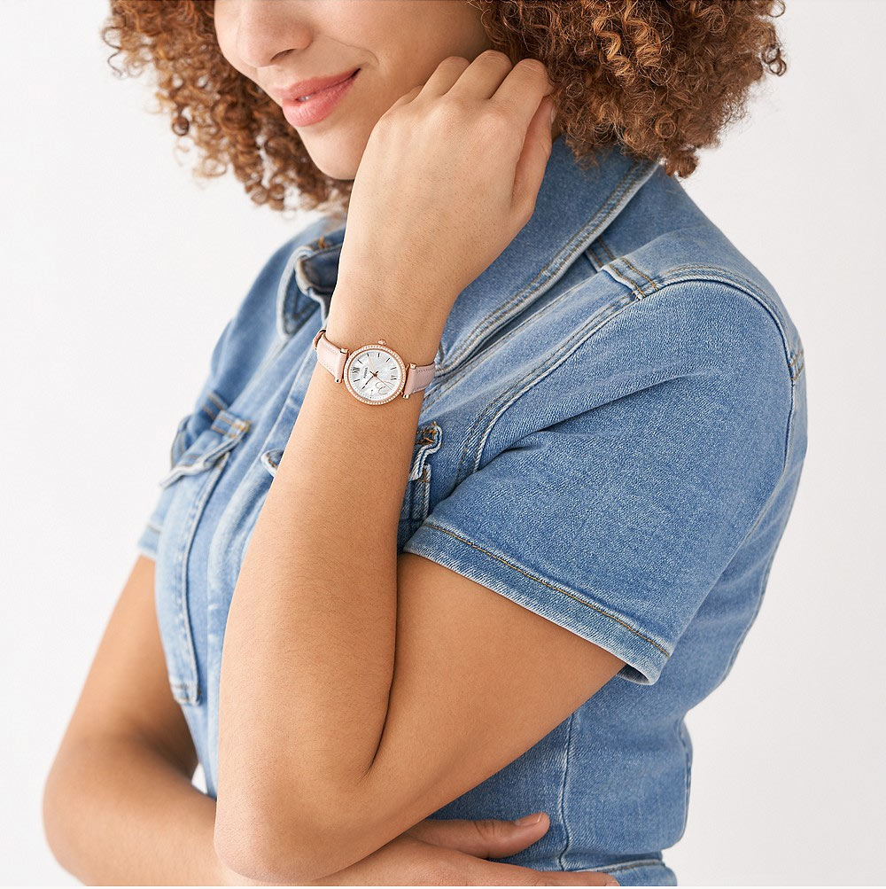 Pomimo miłosnej otoczki zegarek z masą perłową i kryształkami Fossil Carlie Mini świetnie odnajdzie się także w roli codziennego eleganckiego dodatku na rękę. Połączenie nakładanych prostych indeksów z rzymskimi, doza niezwykłego blasku, odcienie ożywiające duszę, jak i przyjemny komfort w noszeniu to doskonały wybór na każdy dzień.