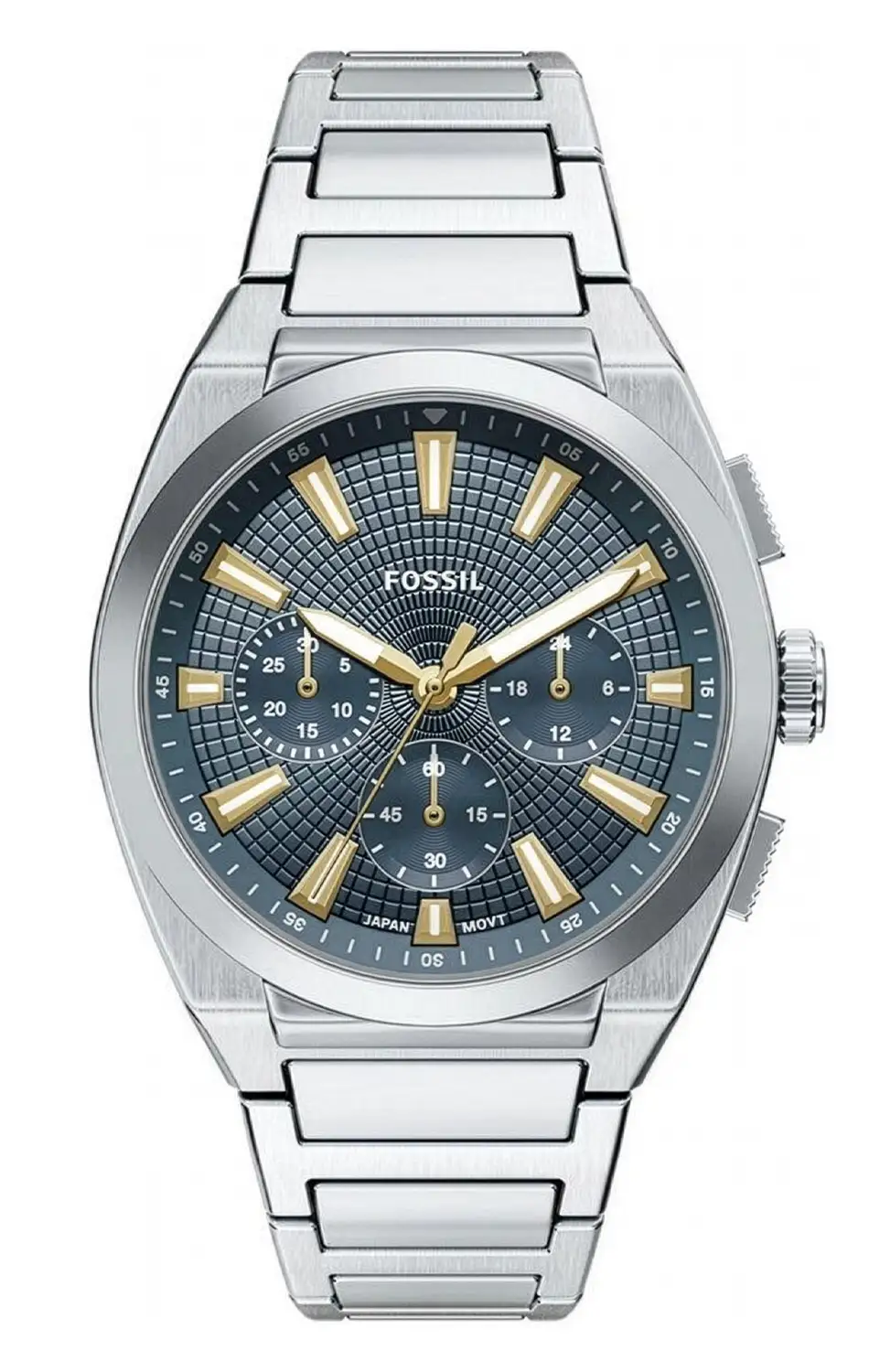 Zegarek męski Fossil Everett Chronograph FS6154 to esencja klasy i nowoczesnej elegancji, stworzona dla mężczyzn, którzy cenią sobie wyrafinowany styl i wysoką jakość wykonania. Jego bransoleta i koperta w kolorze srebrnym tworzą efektowną całość, doskonale podkreślającą charakter każdego outfitu - od casualowego po formalny. Model ten wyróżnia się czystym, geometrycznym designem, który idealnie wpisuje się w aktualne trendy męskiej mody, a jednocześnie zachowuje ponadczasowy charakter. Koperta o średnicy 44 mm zapewnia idealną równowagę między nowoczesnym wyglądem a klasyczną elegancją, dzięki czemu Fossil Everett Chronograph to czasomierz zarówno efektowny, jak i uniwersalny. Jego tarcza w niebieskim odcieniu z giloszowanym wzorem dodaje mu unikalnej faktury i głębi, a delikatnie zaznaczone indeksy i wskazówki zapewniają doskonałą czytelność. Model ten wyróżnia się sportowym chronografem, którego liczniki starannie nałożono na tarczy. Całość podkreśla subtelnie umieszczone okienko datownika, które dodaje zegarkowi funkcjonalności bez zaburzania jego minimalistycznego stylu.