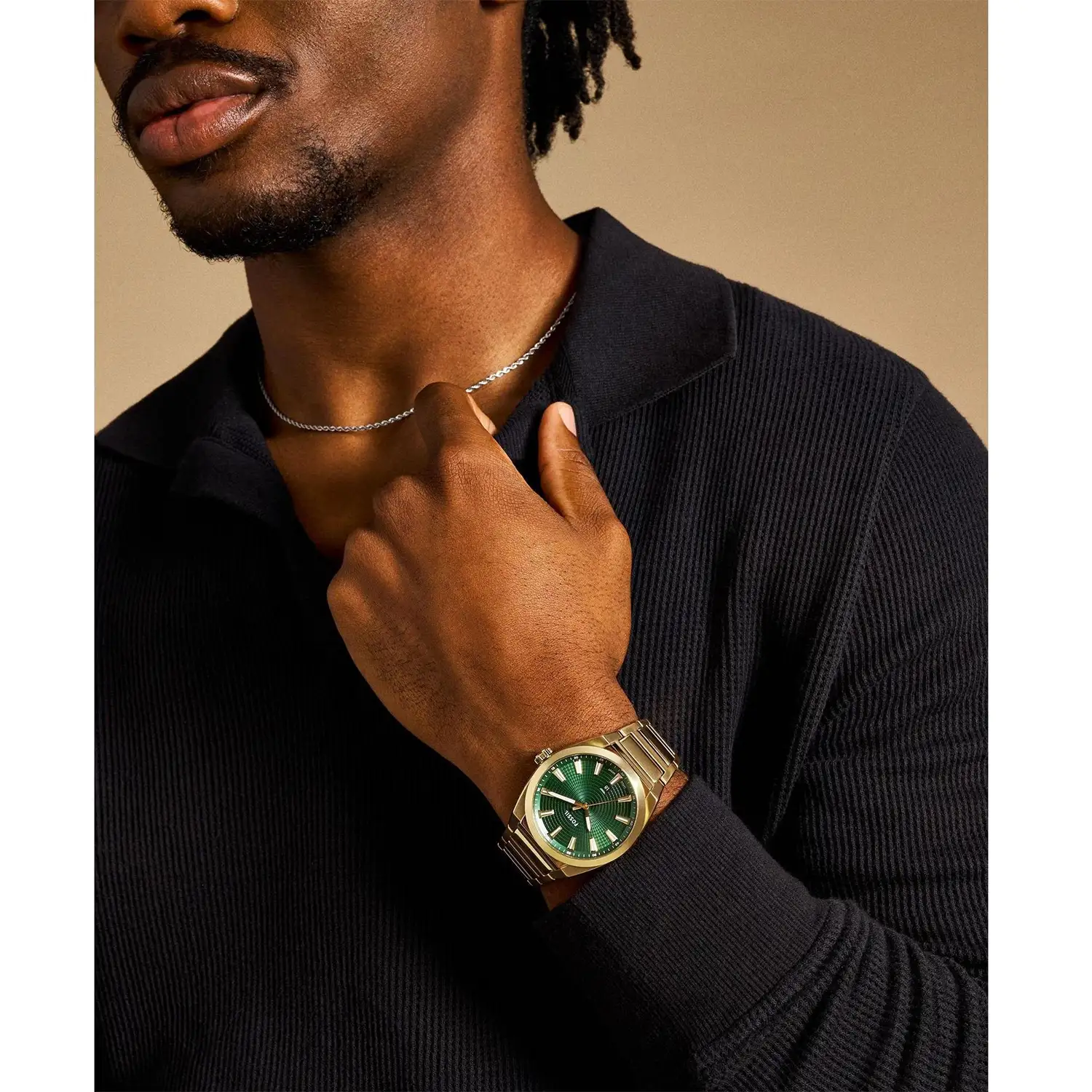 Zegarek męski Fossil Everett FS6090 to wyrazisty model o nowoczesnym, miejskim charakterze, w którym złocona koperta i bransoleta tworzą spójną, mocną wizualnie całość. Średnica koperty 41 mm nadaje mu zdecydowaną obecność na nadgarstku, ale bez efektu przesady, dzięki czemu zegarek pozostaje uniwersalny i dobrze wyważony. Zielona tarcza z geometryczną fakturą i nakładanymi indeksami buduje głębię oraz kontrast, który przyciąga wzrok i podkreśla współczesny styl kolekcji Everett.