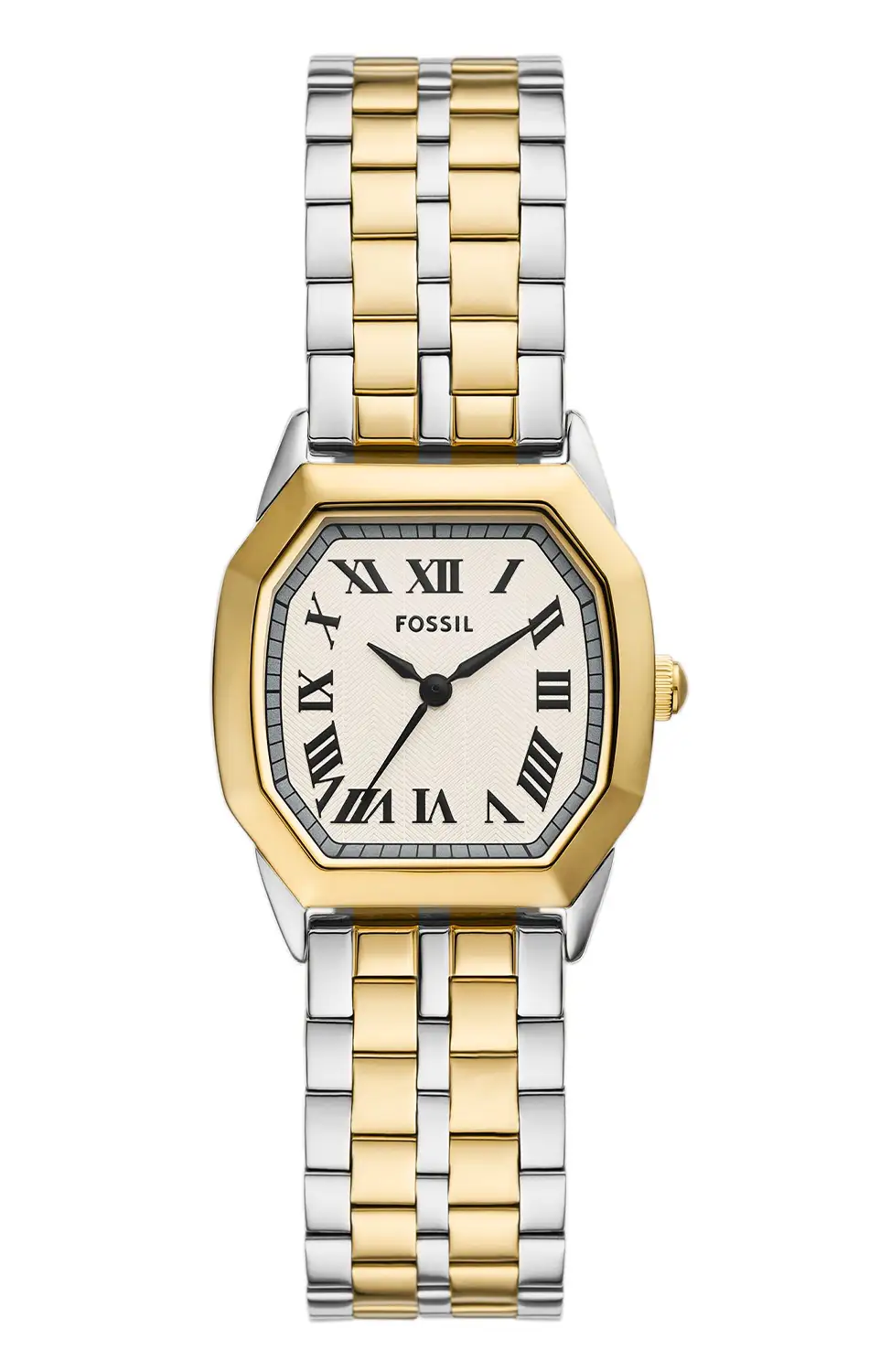 Zegarek damski Fossil Harlow ES5362 to wyraźny ukłon w stronę aktualnych trendów, w których klasyczna forma spotyka się z modowym wyczuciem detalu. Koperta bicolor o kompaktowej średnicy 27 mm nadaje całości eleganckiego, biżuteryjnego charakteru, a prostokątny kształt subtelnie wyróżnia ten model na tle klasycznych, okrągłych czasomierzy. Jasna tarcza z rzymskimi indeksami buduje wrażenie ponadczasowości, jednocześnie zachowując lekkość i nowoczesny sznyt.