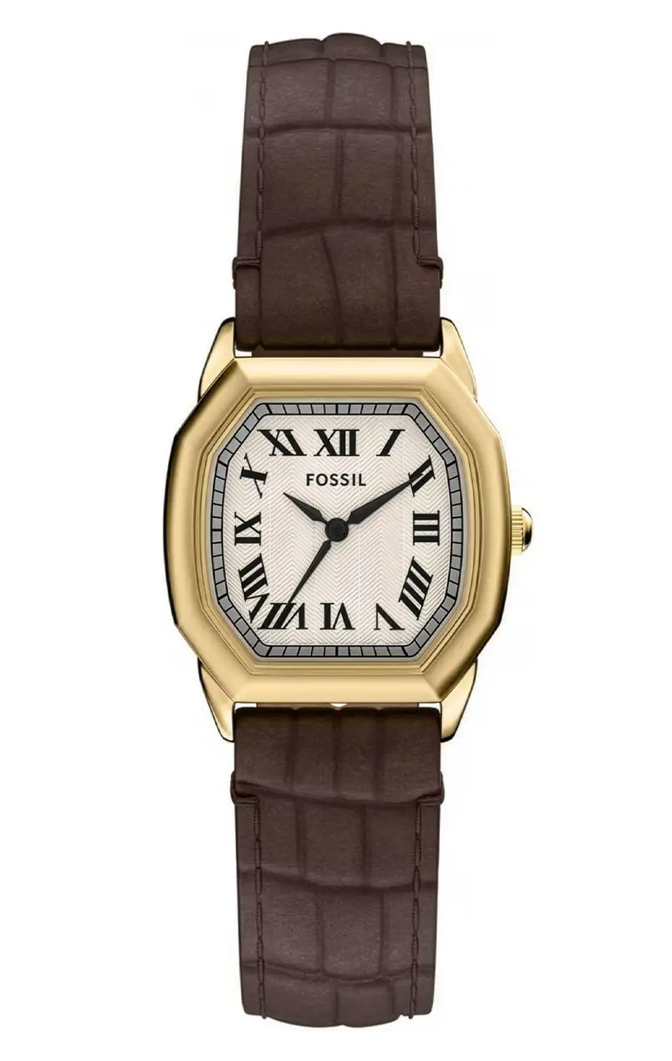 Zegarek damski Fossil Harlow ES5426 to wyraźny ukłon w stronę aktualnych trendów, w których klasyczna forma spotyka się z modowym wyczuciem detalu. Pozłacana koperta o kompaktowej średnicy 27 mm nadaje całości eleganckiego, biżuteryjnego charakteru, a prostokątny kształt subtelnie wyróżnia ten model na tle klasycznych, okrągłych czasomierzy. Jasna tarcza z rzymskimi indeksami buduje wrażenie ponadczasowości, jednocześnie zachowując lekkość i nowoczesny sznyt.