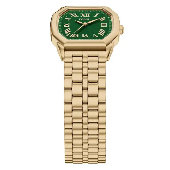 Kwadratowy zegarek damski Fossil Harlow ES5451 to wyrazista propozycja dla kobiet, które lubią dodatki z charakterem i nie boją się przyciągać spojrzeń. Kwadratowa koperta o średnicy 32 mm nadaje mu nowoczesnej, biżuteryjnej formy, a złota kolorystyka podkreśla elegancki, modowy styl. Zielona tarcza z delikatną fakturą i rzymskimi indeksami tworzy efektowny kontrast, dzięki czemu zegarek prezentuje się niezwykle stylowo i wyróżnia się na nadgarstku.