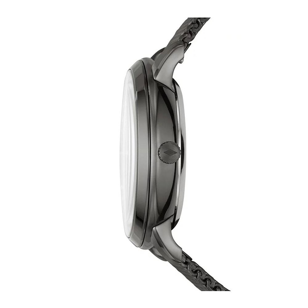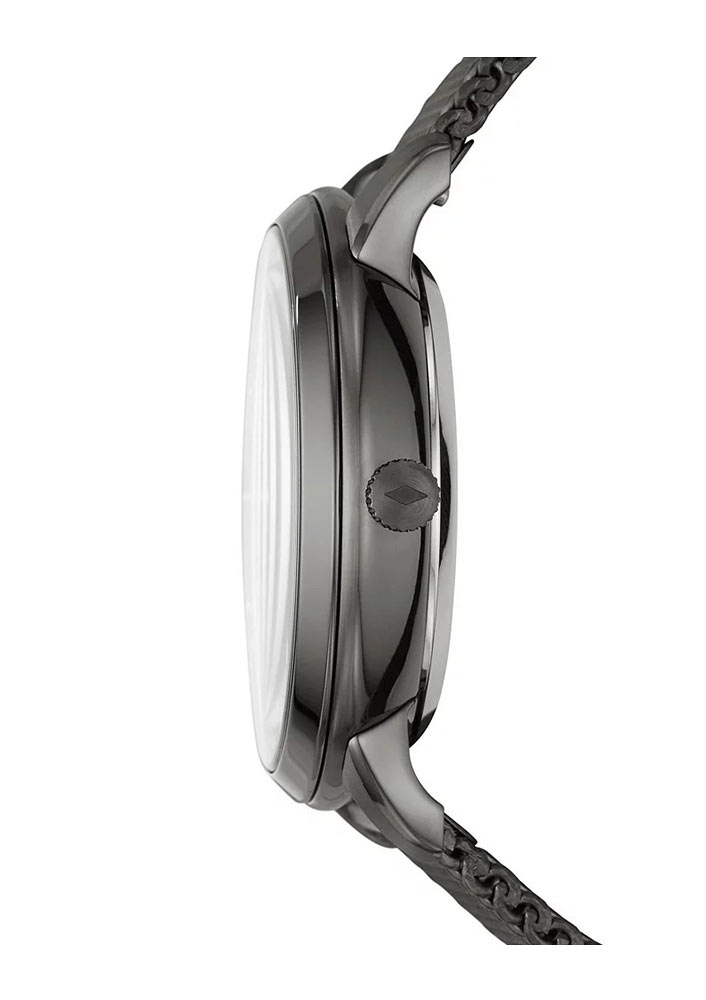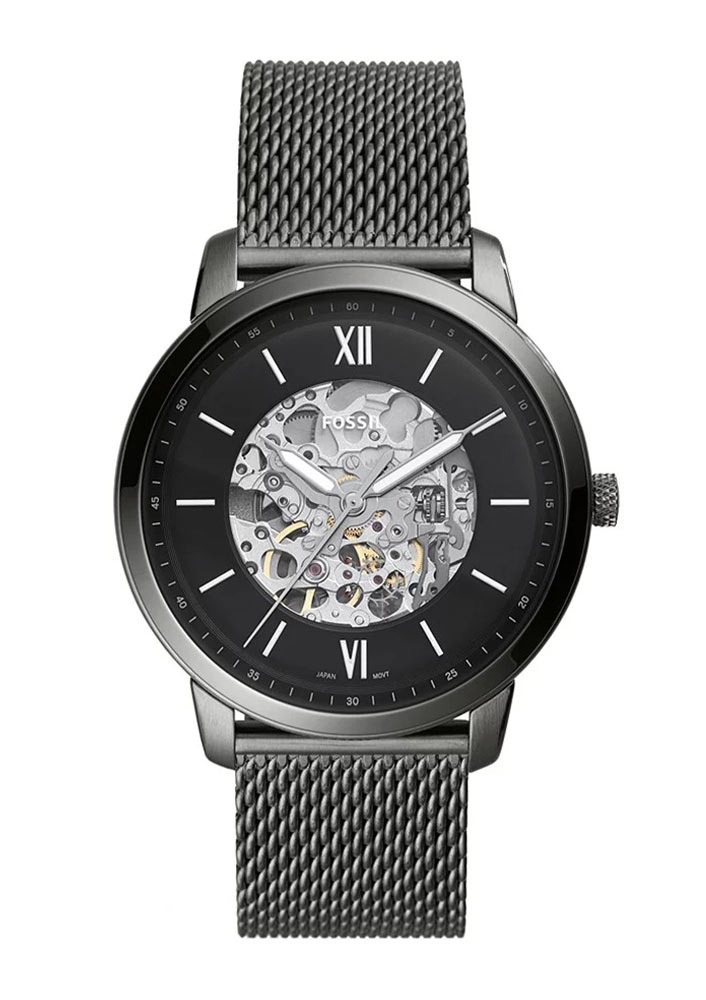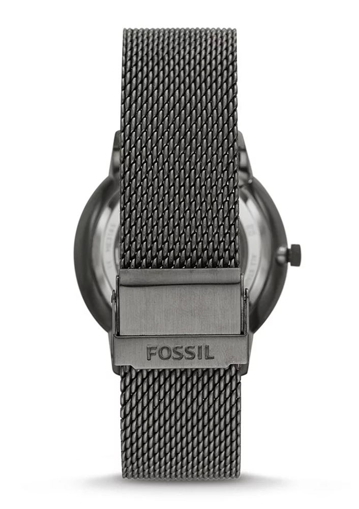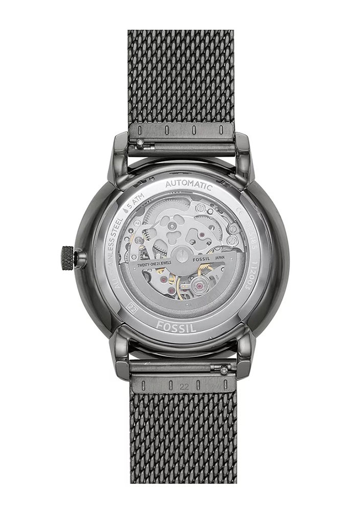 Automatyczny zegarek męski Fossil oferowany jest w stalowej 44-milimetrowej kopercie. Koperta w kolorze szarym — smoke, zestawiona jest z lekką siatkową bransoletą typu mesh. Bransoleta wyposażona została w zapięcie motylkowe, które zapewni komfort i bezpieczeństwo w czasie noszenia tego modnego zegarka Fossil. Producent ułatwił wymianę bransolety dzięki specjalnemu systemowi szybkiej wymiany bez konieczności używania dodatkowych narzędzi. Na rewersie tego męskiego zegarka Fossil umieszczony został transparentny dekiel. Okno w deklu pozwala podziwiać pracę automatycznego mechanizmu.