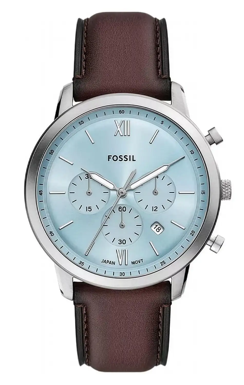 Zegarek męski Fossil Neutra Chronograph FS6109 to propozycja dla miłośników wyważonego stylu, w którym klasyczna elegancja spotyka się z nowoczesną funkcjonalnością. Koperta o średnicy 44 mm zapewnia wyrazistą obecność na nadgarstku, a stonowana, jasnoniebieska tarcza zestawiona z brązowym skórzanym paskiem tworzy ponadczasowe połączenie pasujące zarówno do codziennych, jak i bardziej formalnych stylizacji. Smukłe indeksy i subtelne akcenty kolorystyczne nadają całości spokojny, uporządkowany charakter.