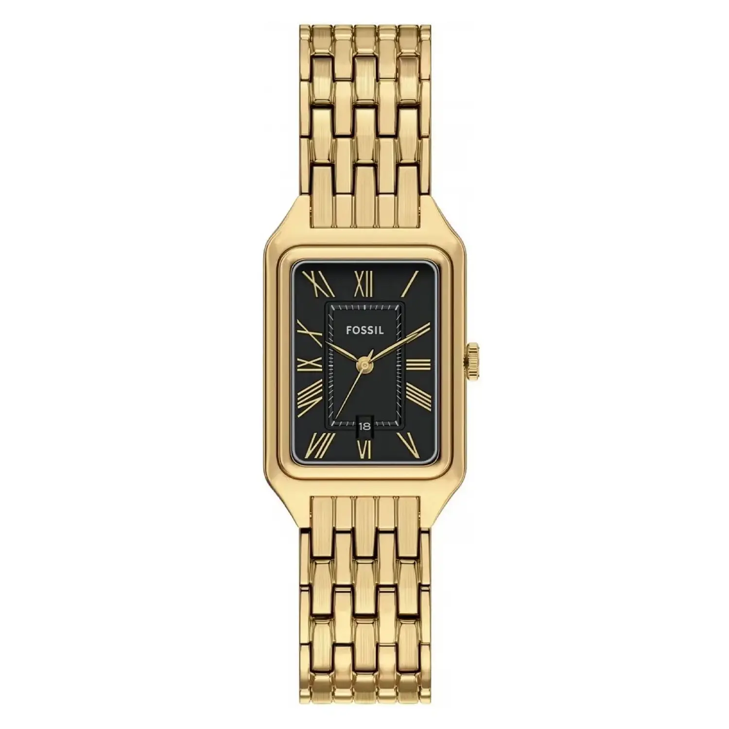 Zegarek damski Fossil Raquel ES5434 przyciąga uwagę od pierwszego spojrzenia wyraźnie biżuteryjną formą, która bardziej przypomina elegancką bransoletkę niż klasyczny czasomierz. Smukła koperta o szerokości 23 mm w złotym kolorze idealnie układa się na nadgarstku, a prostokątny kształt nadaje całości modowego, nieco paryskiego charakteru. Czarna tarcza z rzymskimi indeksami w złotej oprawie tworzy kontrast, który podkreśla luksusowy styl i sprawia, że ten model staje się wyrazistym dodatkiem zarówno do codziennych stylizacji, jak i wieczornych zestawów.