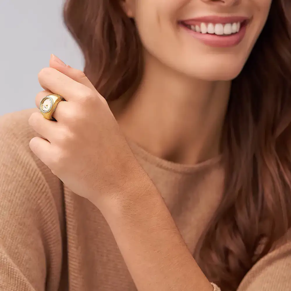 Fossil Watch Ring ES5319 to biżuteryjna interpretacja zegarka, która celowo wychodzi poza klasyczne ramy czasomierza i bliżej jej do designerskiego dodatku niż tradycyjnego modelu na nadgarstek. Forma pierścionka o średnicy 15 mm, pozłacane wykończenie, błyszczące kryształki oraz subtelna, jasna tarcza tworzą spójną całość inspirowaną estetyką biżuterii vintage, ale podaną w nowoczesny, lekki sposób. To propozycja dla kobiet, które traktują zegarek jako element stylizacji, a nie wyłącznie narzędzie do odmierzania czasu.