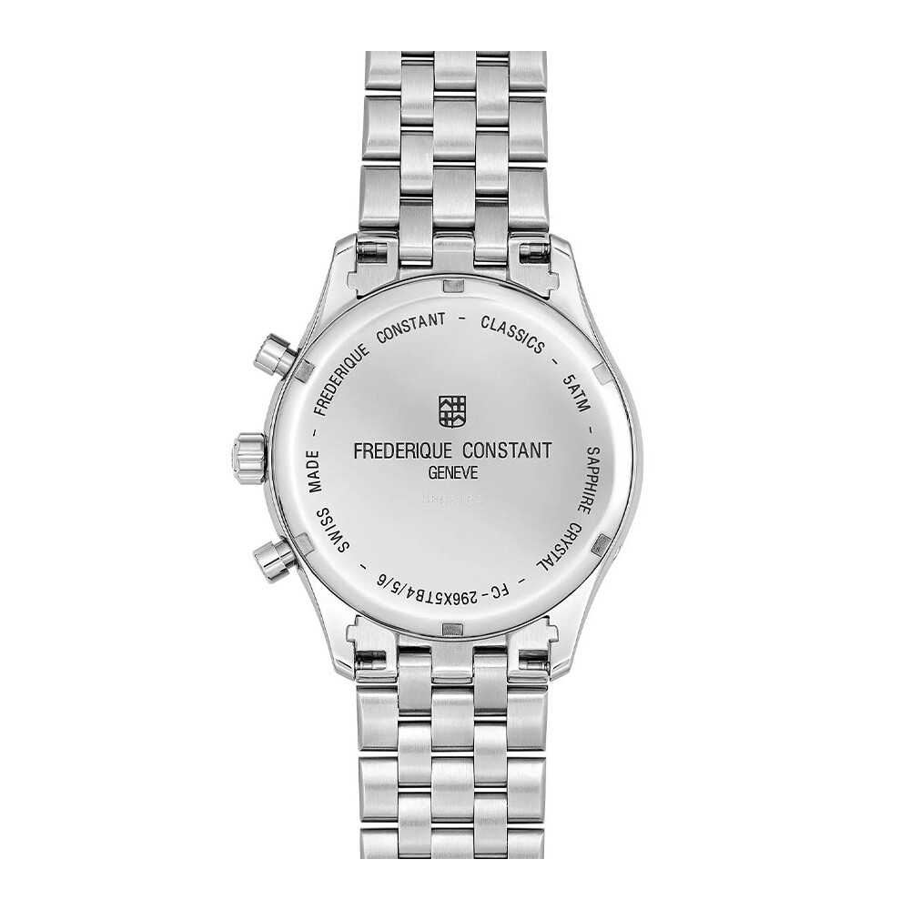 Szwajcarski zegarek męski Frederique Constant Chronograph Triple Calendar to okrągła obudowa, która zbudowana została z wysokiej jakości stali szlachetnej. Po prawej stronie koperty znajduje się koronka oraz towarzyszące jej przyciski funkcyjne. Front to błyszczący, wąski bezel. Na tylnej części czasomierza, całą konstrukcję domyka stalowy dekiel, który jest zakręcany. Zegarek w rozmiarze 40 mm zestawiony został z elegancką bransoletą, którą tworzą małe ogniwa. Bransoleta wyposażona została w zapięcie motylkowe. Zapięcie zagwarantuje bezpieczeństwo i komfort w czasie noszenia zegarka.