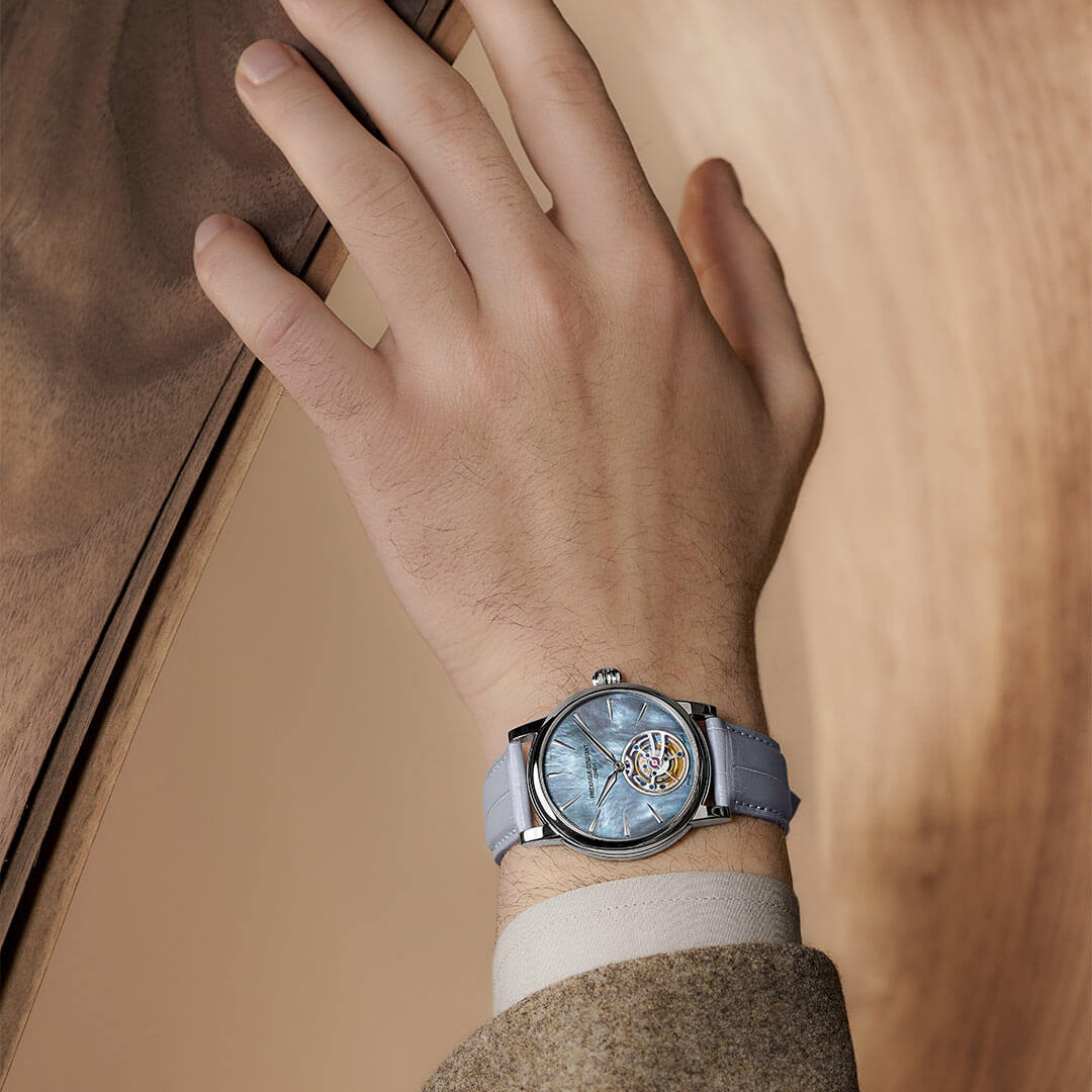 Koperta o średnicy 39 mm została wykonana z 18-karatowego białego złota i wypolerowana na wysoki połysk. Jej minimalistyczna geometria kontrastuje z iryzującą tarczą z masy perłowej, której powierzchnia ożywa pod wpływem światła, odsłaniając subtelne niuanse błękitu i szarości. Na godzinie szóstej znajduje się otwór tourbillonu z mostkiem krzyżowym i sekundnikiem – widok pulsującej pracy mechanizmu jest dostępny zarówno od frontu, jak i od strony przeszklonego dekla. Całość wieńczy pasek ze skóry egzotycznej w delikatnym, pastelowym odcieniu niebieskiego z zapięciem motylkowym.