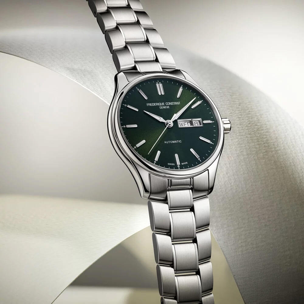 Jednym z najbardziej wyróżniających się elementów tego modelu jest głęboka, błyszcząca zielona tarcza, która w zależności od kąta padania światła mieni się różnymi odcieniami. To wyjątkowy akcent, który dodaje zegarkowi unikalnego charakteru, przyciągając wzrok, ale w sposób pełen klasy i subtelności. Indeksy i wskazówki w kolorze różowego złota doskonale komponują się z kopertą, tworząc harmonijną całość. Kluczową funkcją zegarka jest Day-Date, czyli czytelne okienko wskazujące aktualny dzień tygodnia oraz datę. To rozwiązanie, które podnosi funkcjonalność modelu, sprawiając, że staje się on jeszcze bardziej praktyczny w codziennym użytkowaniu. Automatyczny zegarek męski Frederique Constant Classics FC-304GR5B6B napędza mechanizm szwajcarski, zapewniający płynność działania i precyzję, jakiej oczekuje się od zegarków klasy premium.